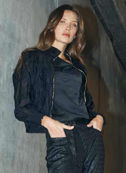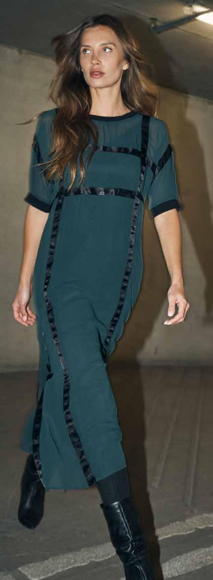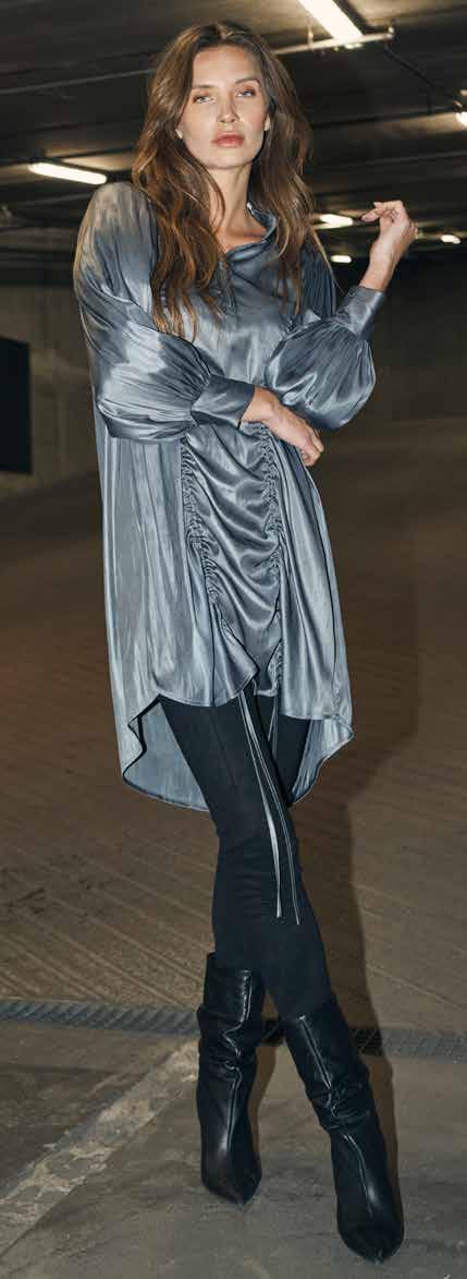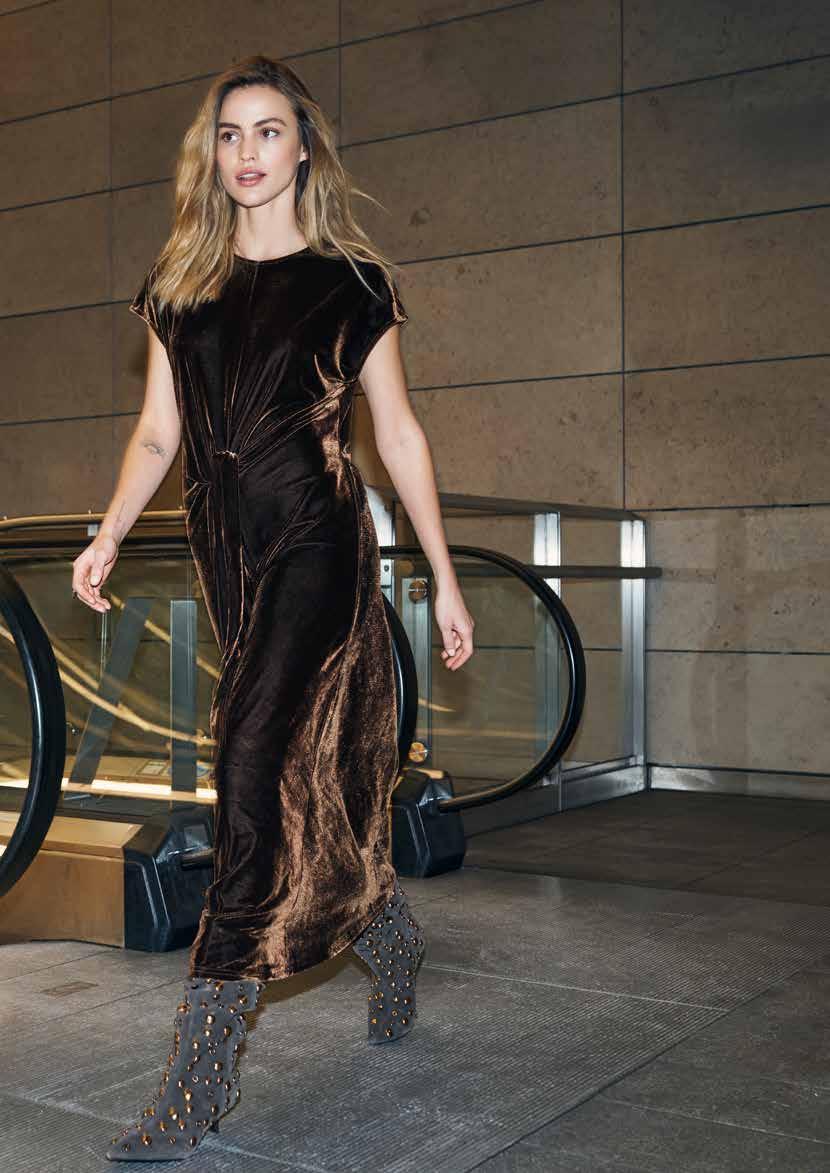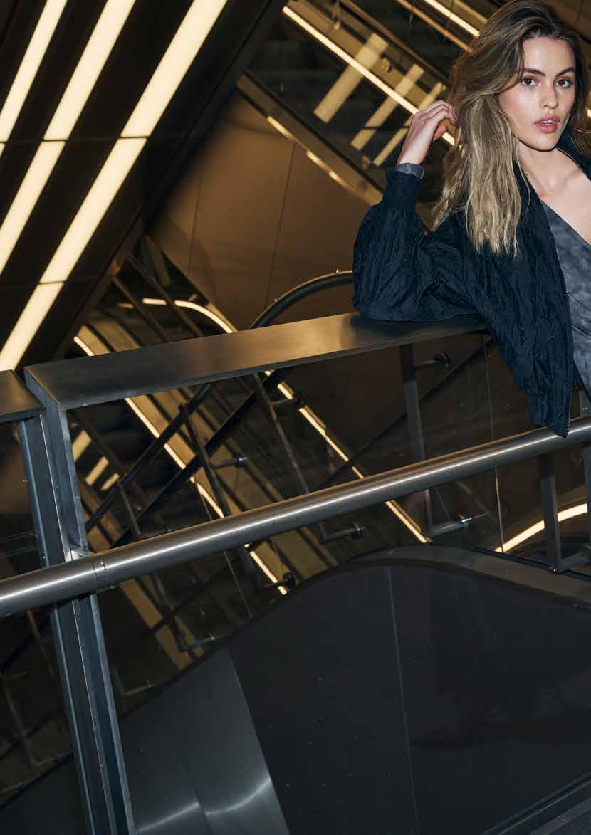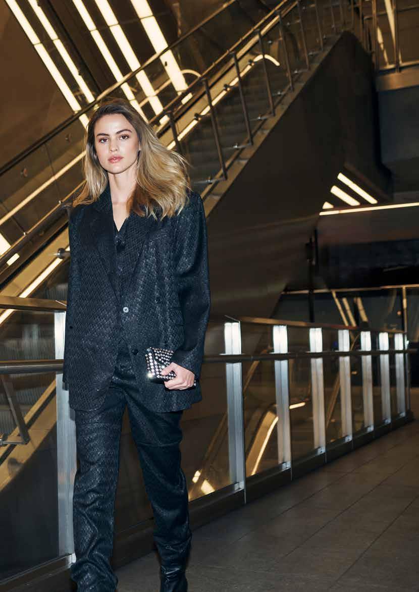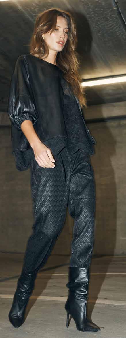This season our muse is a shining jewel against the harsh urban landscape. Decidedly 80s in feel with slouchy pants, dramatic thigh slits and billowing puff sleeves, this collection is a modern take on eras gone by. Rich textures of crushed velvet and fluid silhouettes come to life on the body in motion – these were pieces made for dancing. Think loose pants tucked into boots and accented with studs and metallic embellishments. From midnight black to petrol green and iron grey, the palette is a far cry from the garish neons of disco days. Instead offering a more sophisticated kind of glamour. She carries this polished aesthetic into her day wardrobe, with tailored jackets and structured midi dresses that can be layered and reworked as the day unfolds.