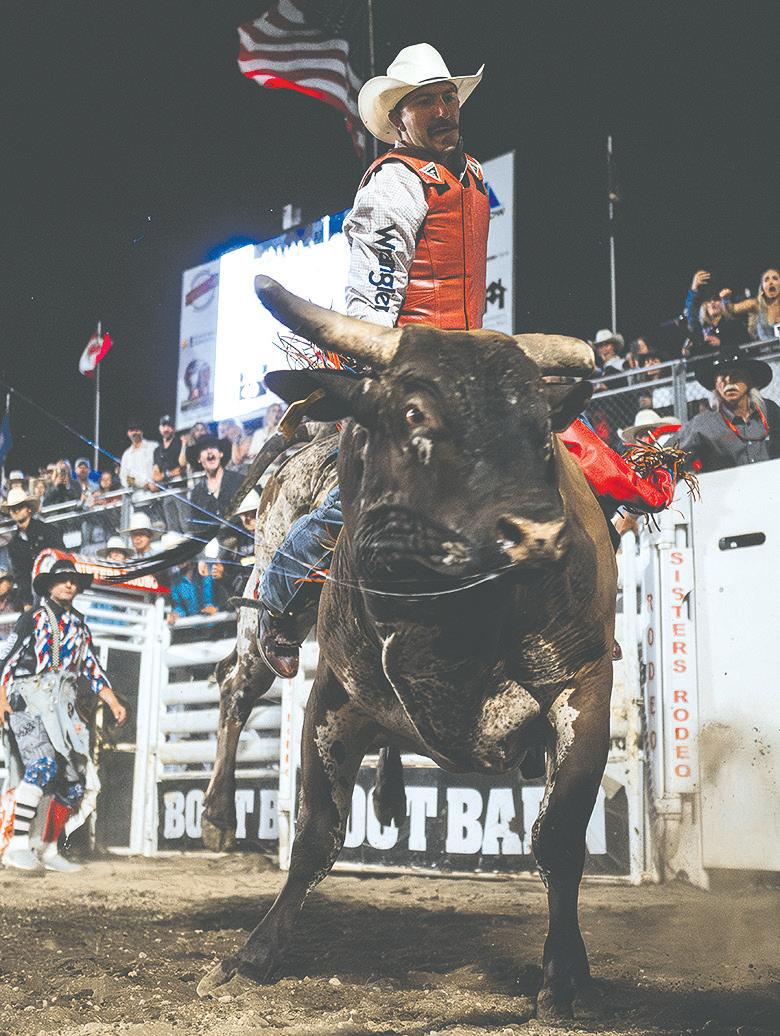 In two terrifying minutes, a bull in the range of 1,900 pounds eluded wranglers on the Sisters Rodeo arena floor and like a deer, running at full speed, jumped the fence in the red section at the arena’s southern end. The bull catapulted its bulk over the sixfoot metal fence before exiting the red section entry way and into the food court. This was the conclusion to Saturday night’s sellout event, the fourth of the five scheduled presentations of the 84th Sisters Rodeo. Fans scattered in all directions, horrified as the bull — later identified by the name Party