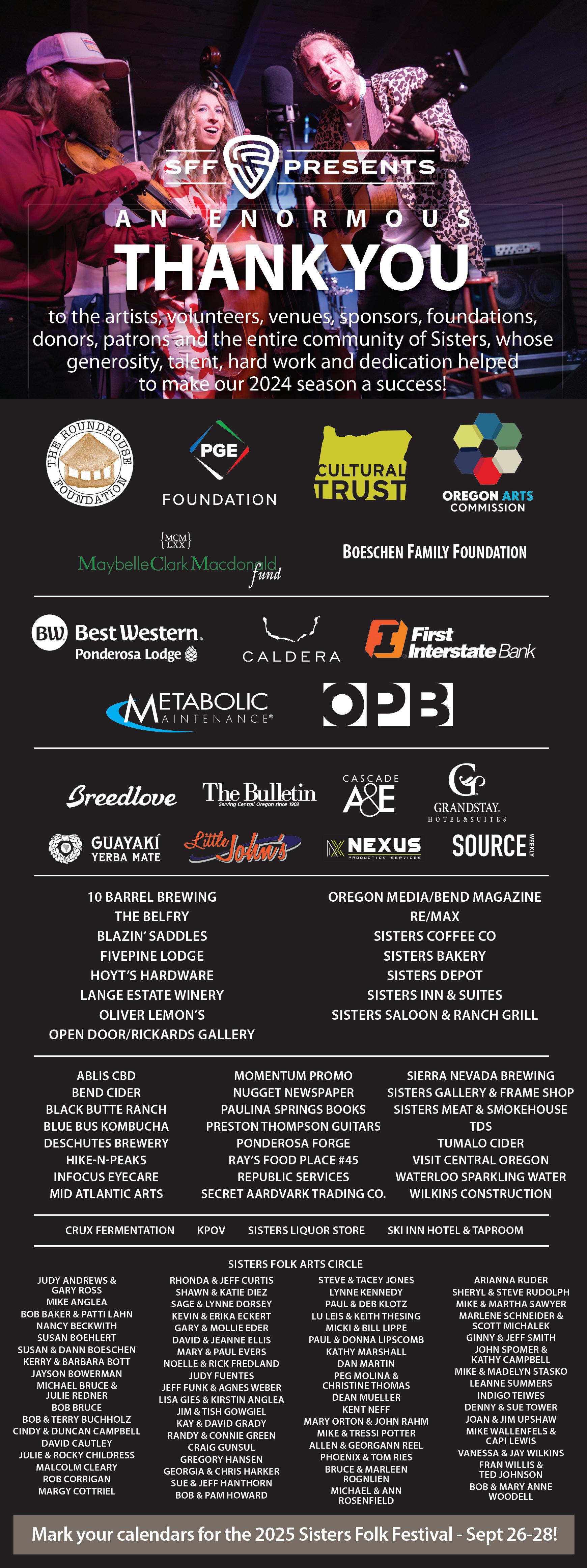 SFF Presents Board Chair Leanne Summers summarized it this way: “We’ve got something special in this community. The 2024 Sisters Folk Festival exemplifies that extraordinary, hard-to-define gift. In a time when it is easy to dwell on differences,