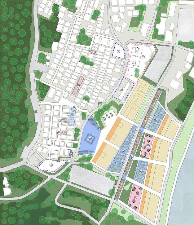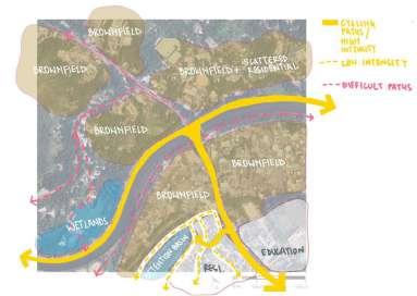 Green infrastructure is retrofit into industrial zones. Accessible connectivity to the village is enabled.