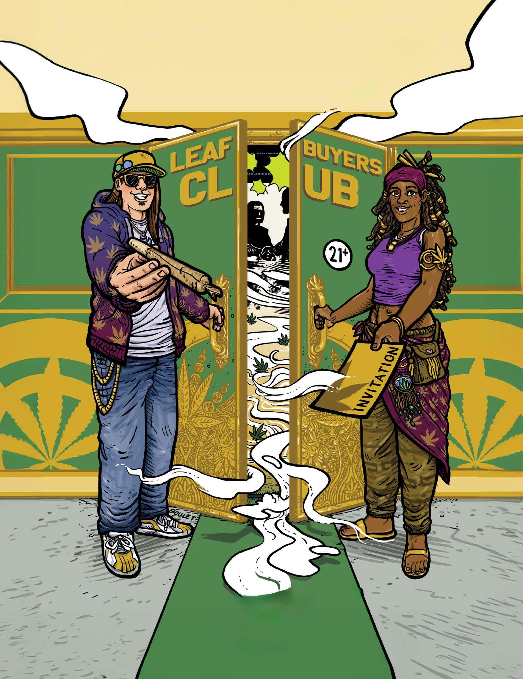 Hailing from Indonesia, Ilham is a prolific illustrator and commercial artist known for his trippy and hyperfuturistic style, whose work has been commissioned by national brands and touring musicians for over a decade. Leaf COO Tom Bowers created the concept of a dab bar set in a Blade Runner scene (cue the noodle slurp), and Ilham brought home the neon vision with abundant stoner details. For even more of his art, be sure to check out our profile in this month's Studio Sessions column from Leaf contributor Matt Jackson, pg. 54-55.