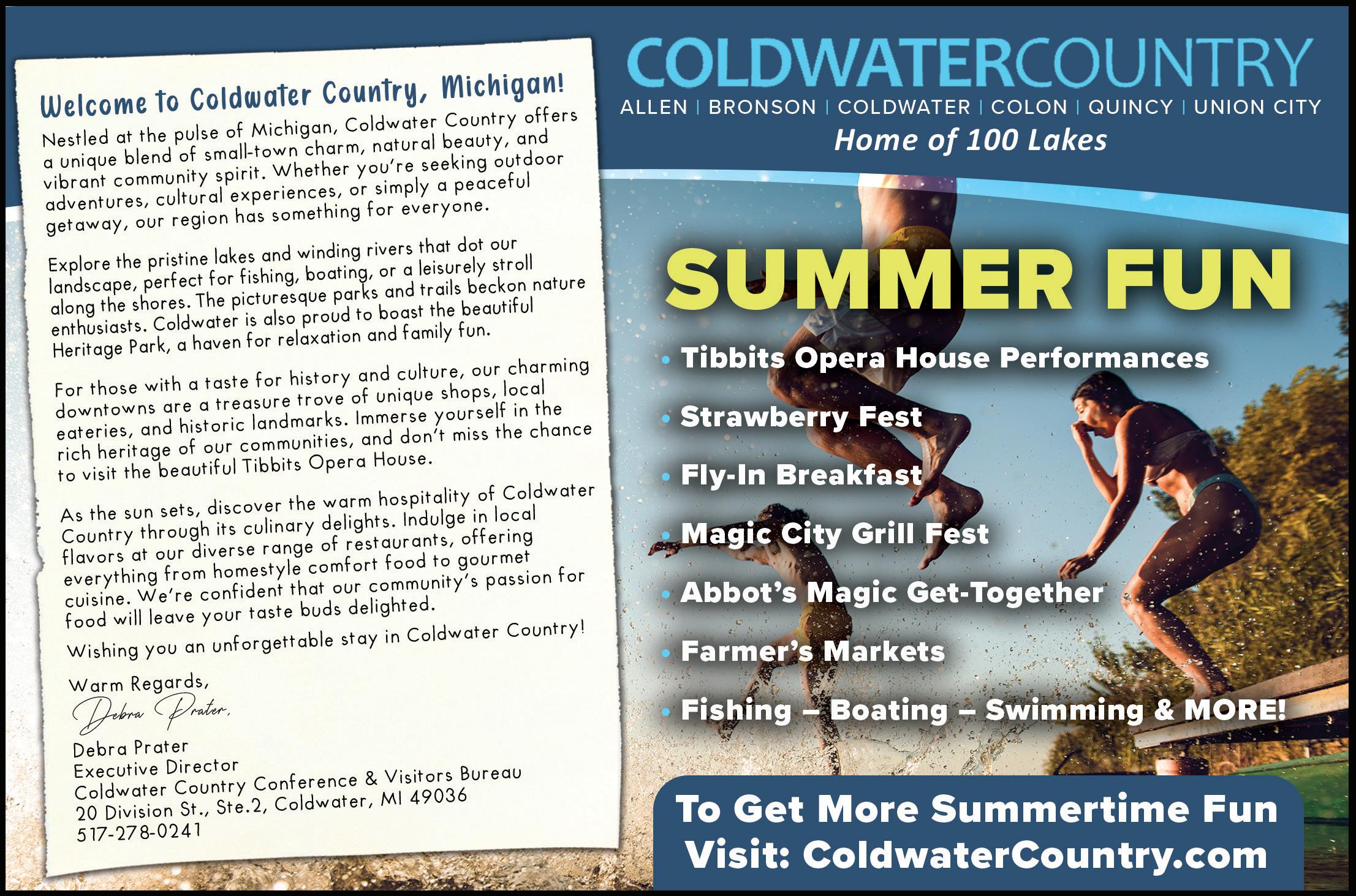 “Michigan’s Coldwater Country offers so many vacation experiences for families and friends to enjoy,” says Debra Prater, executive director of Coldwater Country Conference & Visitors Bureau. “With freshwater lakes, beautiful parks, fun things to see and do, plus local events, visitors can immerse themselves in the beauty and hospitality of our communities.”
