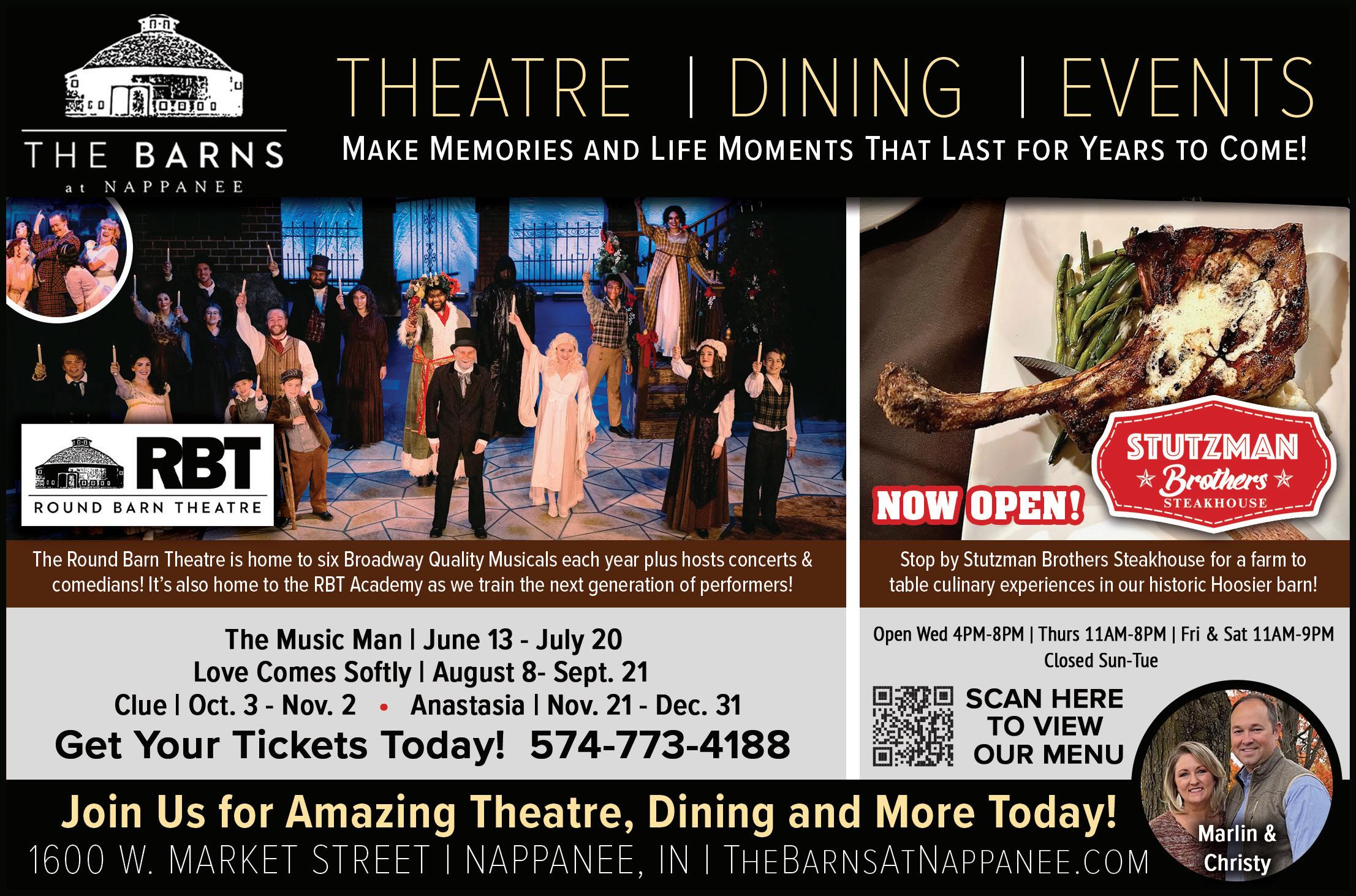 “That show runs from Aug. 8 to Sept. 21,” Humbarger says. “We even have a ‘Hearties Weekend’ [for Hallmark Channel fans] planned in August to come to The Barns at Nappanee property to enjoy great food, have meet and greets with the cast, see the show, and then travel to see ‘When Calls the Heart’ in Shipshewana.”
