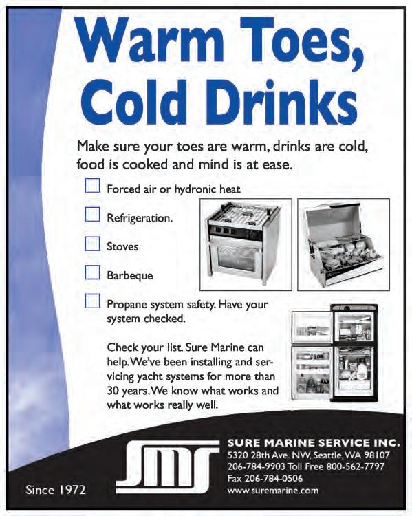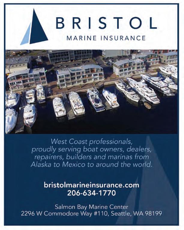 79 Boat & Yacht Insurance Global Reach Local Service Since 1959 www.marinersins.com 800-639-0002 800-992-4443 CHANGE A LIFE. DONATE YOUR BOAT. Support local and regional programs for children and young adults through the charitable donation of your boat. The Pacific Marine Foundation is a 501(c) 3 non-profit organization funding regional programs such as Northwest Youth Services, Sea Scouts, Boys & Girls Clubs, and local public school education foundations. A substantial tax savings and the possibility of a partial cash sale makes a charitable donation a very attractive alternative for any owner who is considering selling their well-found power or sailing yacht. www.pacificmarine.org Yachtdonation.info(206) 225-3360 KEEPING YOU ON THE WATER • Heating • Electrical • Electronics • Plumbing • Head Systems • Propulsion & Generators • Bow & Stern Thrusters • Glass & Wood Fabrication MonkeyFistMarine.com 206-285-2600 TWO LOCATIONS: Elliott Bay Marina and Ballard on the Ship Canal