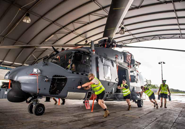 Working just outside the hangar is a team of aircraft technicians fitting blades to the first NH90. Some are covered head to toe in wet weathers, hoping to keep the rain out of their boots. Others have given up all together on staying dry and although the rain permeates everything it feels good to have the sweat rinsed away.