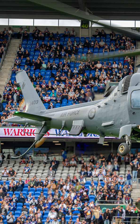 “Up the Wahs!” Special match ball delivery via an Air Force A109 Light Utility Helicopter into Go Media Stadium, Mount Smart. The pilot made a 360° spin prior to landing, which gave a great photo opportunity for the crowds gathered for the Warriors’ Anzac Day match against the Gold Coast Titans.