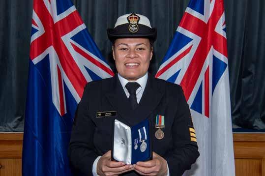 POSTD Marieta Makasini receives her Royal New Zealand Navy Long Service and Good Conduct Medal.