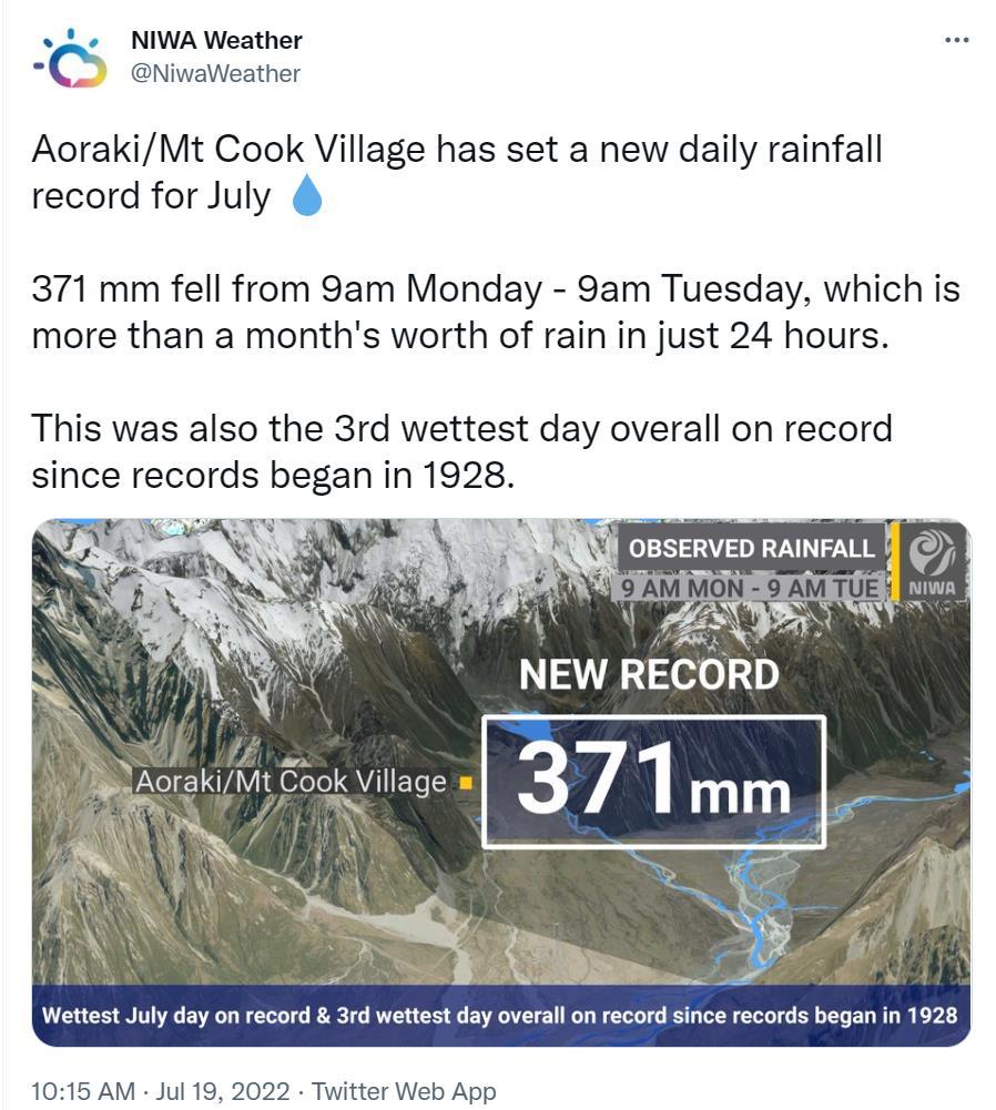 • 550mm rain recorded from July, 2022 storm in Mt Cook Village, most between 18-19 July.