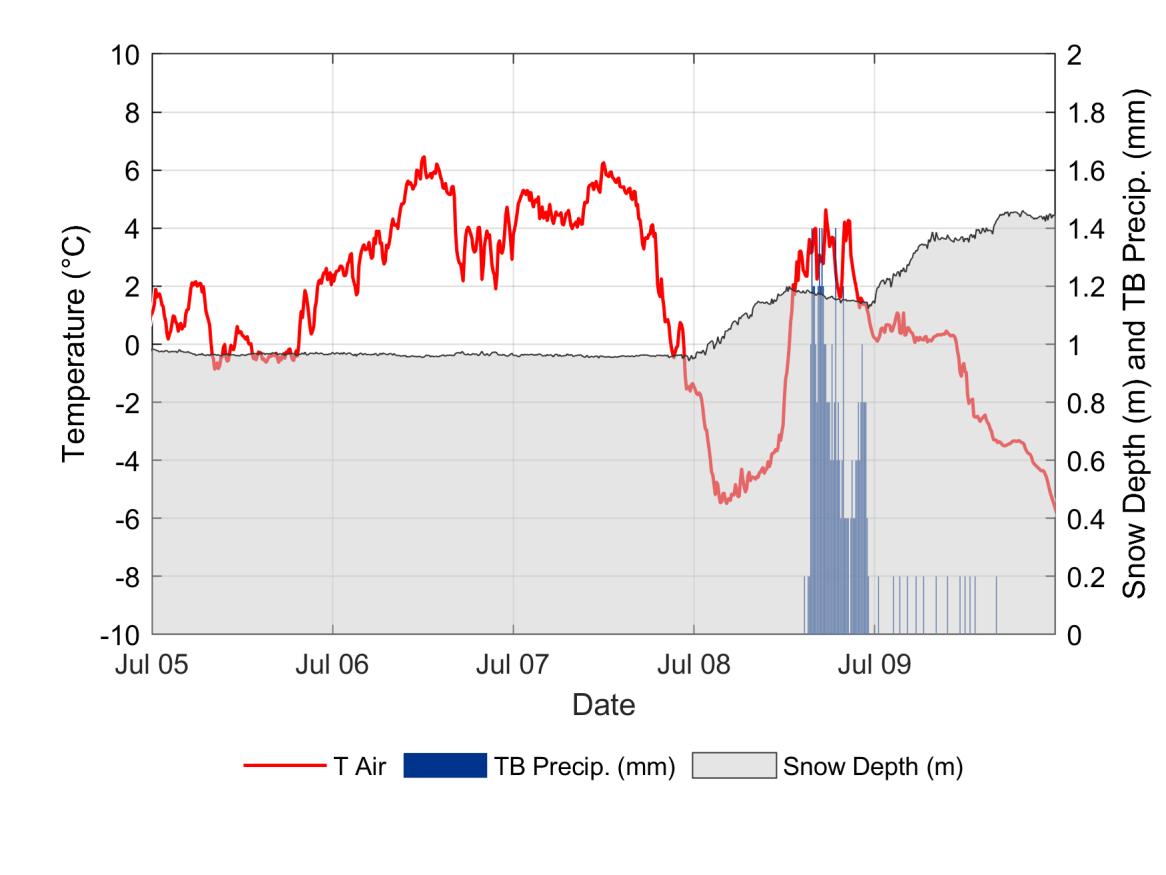 • Snow depth is measured using a sonic ranger to measure the distance to the top of snowpack