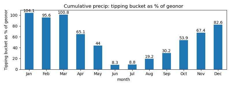 2: Monthly ratio of tipping bucket/geonor totals for periods of concurrent measurement May 2017-Dec 2019.