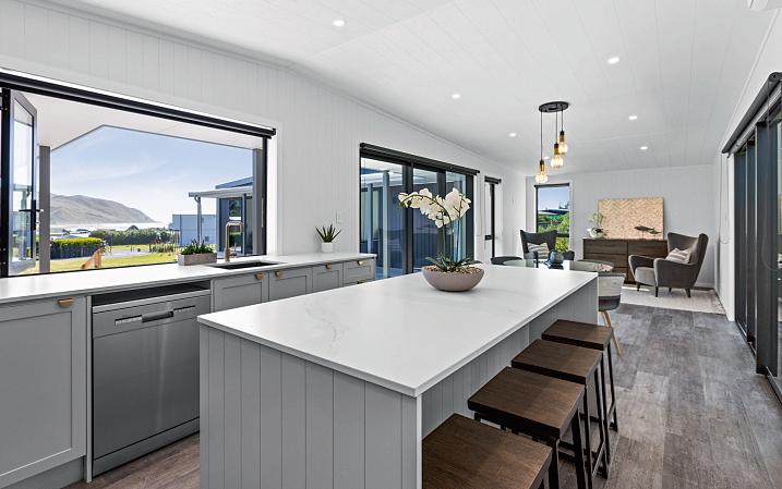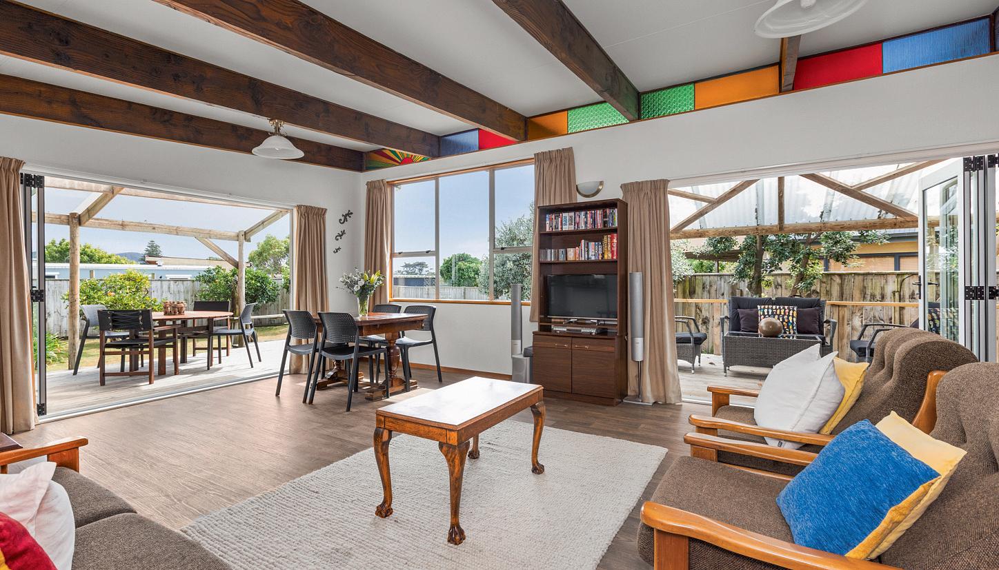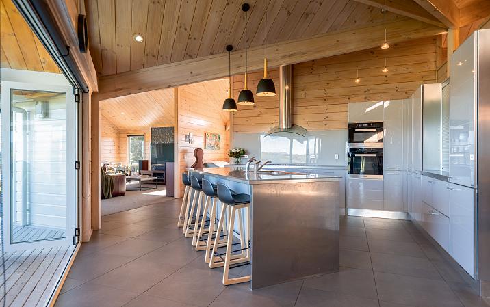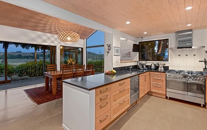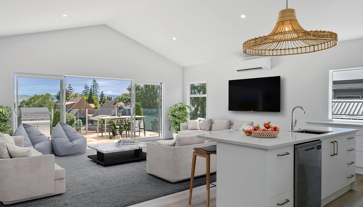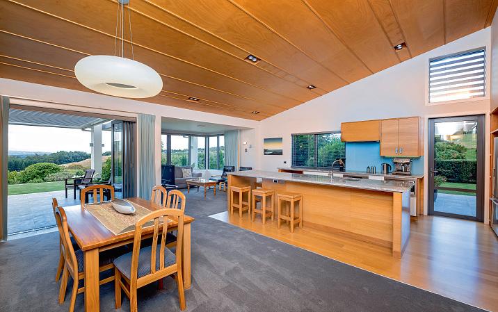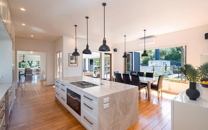 The unique and flexible open floor plan offers ample space for all family members to enjoy, while the heart of the home is the open-plan dream kitchen and living area, which opens out to a private courtyard. The feature ply high ceilings provide a sense of space, enhanced by Trubridge lighting and exposed beams for a designer finish.