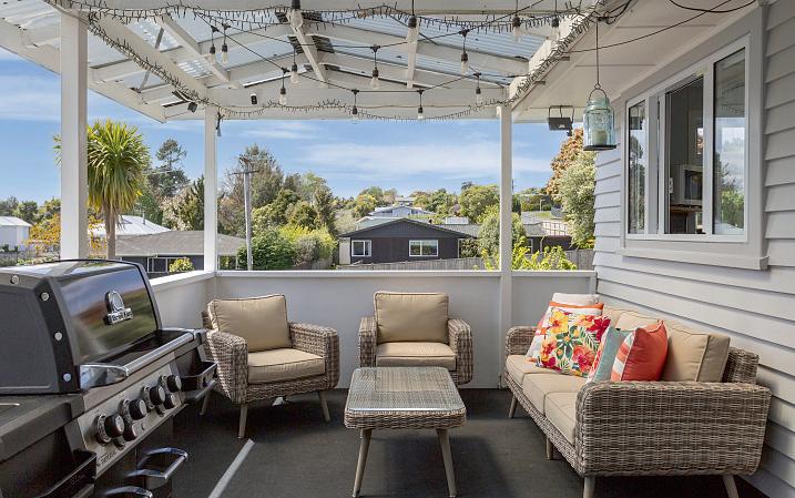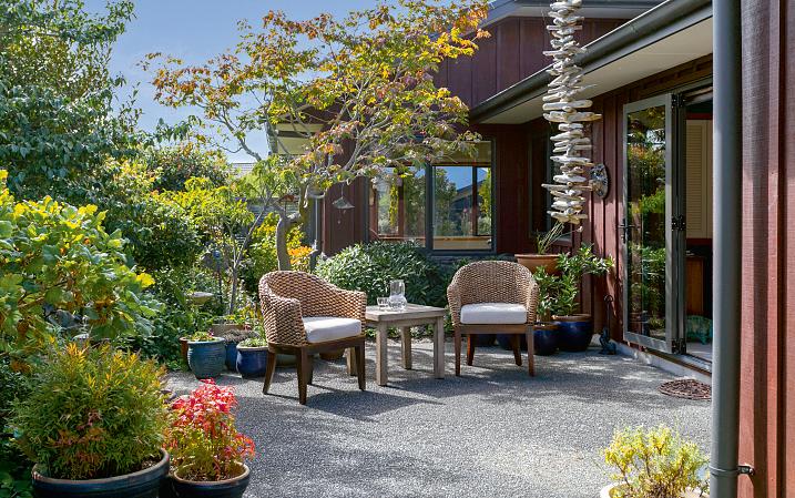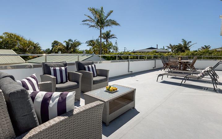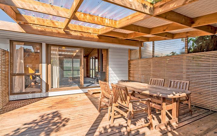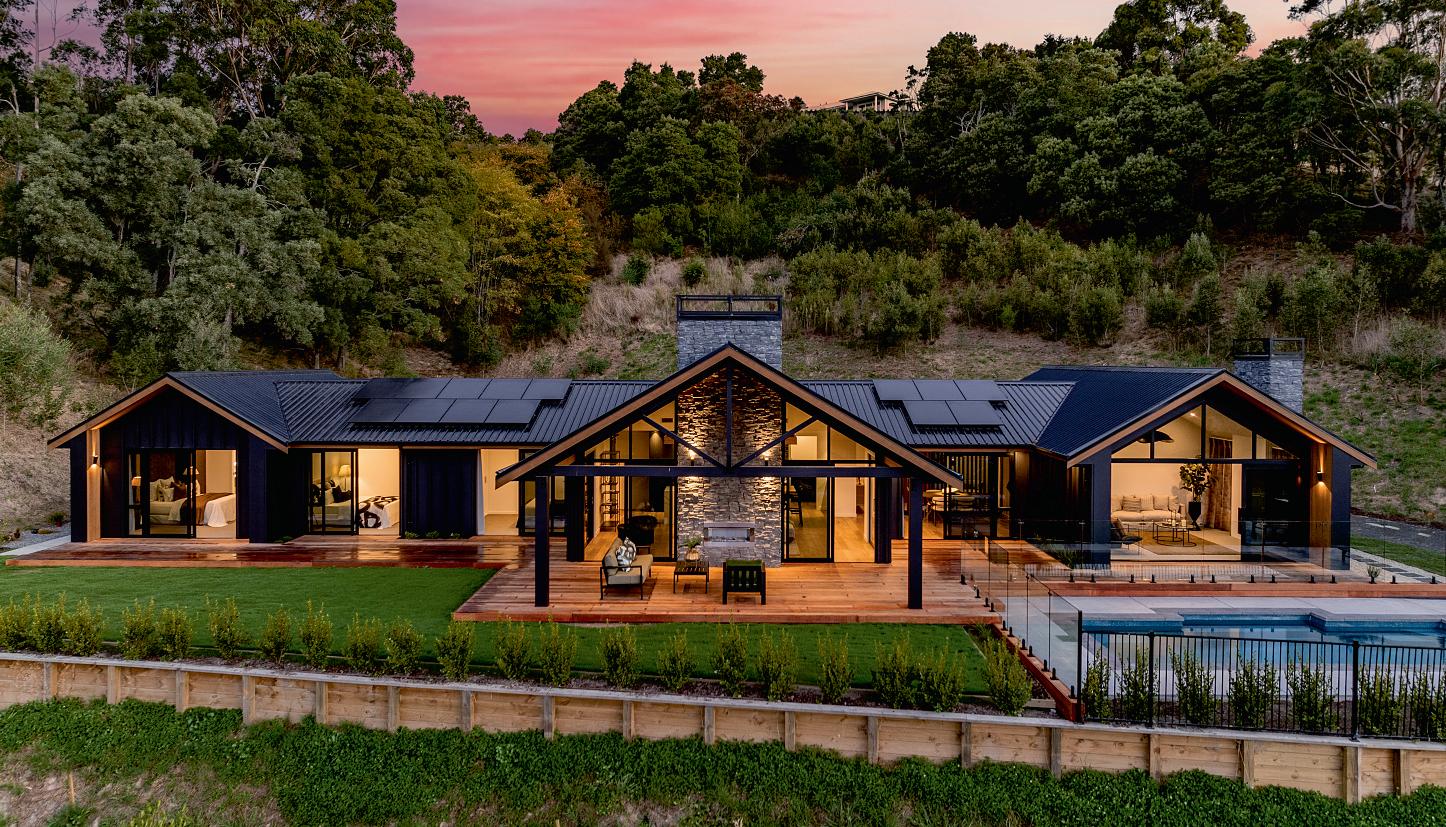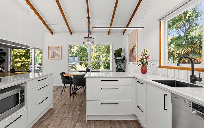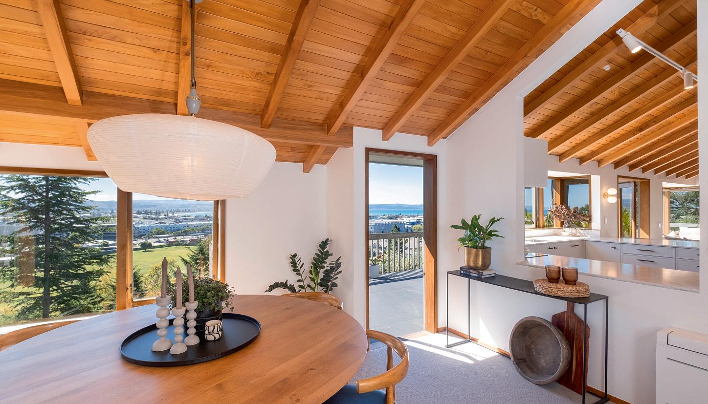The unique and flexible open floor plan offers ample space for all family members to enjoy, while the heart of the home is the open-plan dream kitchen and living area, which opens out to a private courtyard. The feature ply high ceilings provide a sense of space, enhanced by Trubridge lighting and exposed beams for a designer finish.