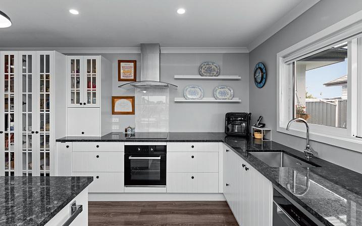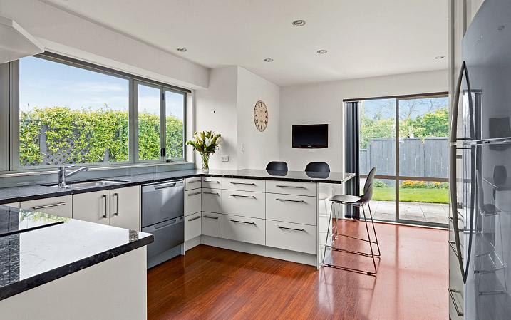The residence is anchored by an open-plan kitchen and dining space, fitted with a new Prestige kitchen that shines with granite benchtops, quality appliances, and an integrated dishwasher.