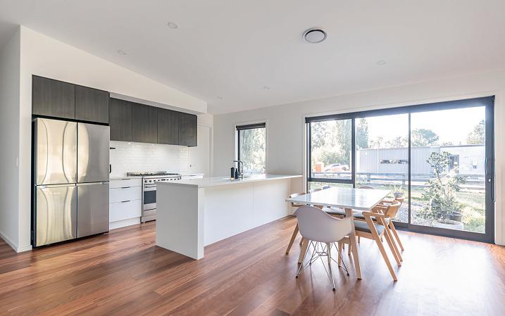 The kitchen and dining area are combined in an open-plan layout, providing a functional space for meal preparations and family time. Adjacent to this, the lounge serves as a flexible living area, with doors opening to a west-facing deck. This outdoor extension invites modest al fresco dining and leisure, with a view of the setting sun.