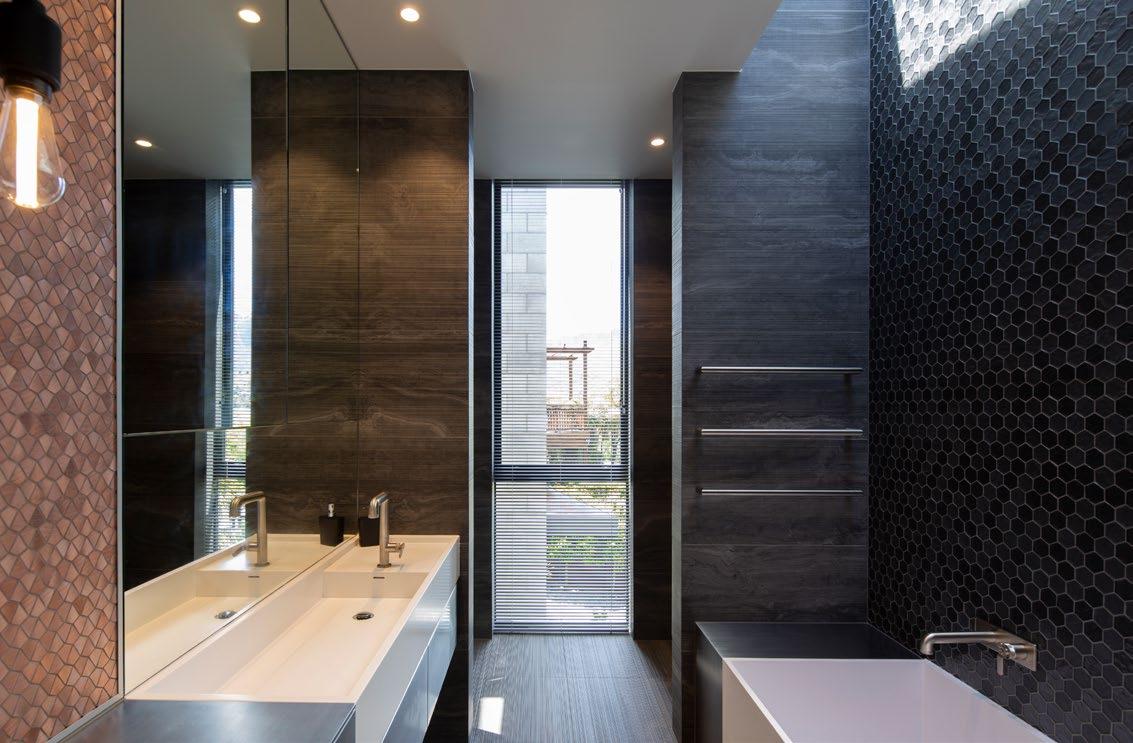 The exterior of the original ivy-covered stone cottage (the town’s original butcher shop) was preserved and flawlessly blended with concrete block and steel giving the home striking street appeal.