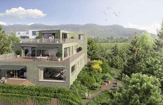 eineingeschränktes Nutzungsrecht, welches besagt,dasshiergebaute Objekte 3,6 Meternichtüberragen dürfen. Im Klartext: Mehr alseingeschossigeWohnbautenliegen nichtdrin. Nachbarnhattendieses Servitut vorJahrzehnten wohlweislich durchgesetzt, um nichtumdas beneidenswertePanorama gebrachtzuwerden. Diese Limite wargegeben, unddarum herumhattenLischerPartnerArchitekten ihrProjekt zu definieren. Sie entwarfenvierzweigeschossigeGebäude, dieSchubladengleich, in denHanggeschobenwurden.