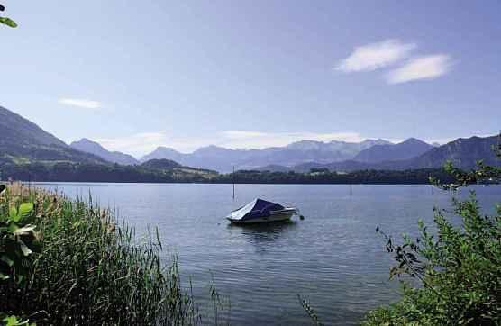 DerArchitekt hatdie Schrägedes Daches konsequent weitergezogenund denPlatz für dasAussenzimmerförmlich ausdem Kalksteindach herausgeschnitten. Die Aussicht stehtimKontrastzur Strengeder Architektur;sie erstrecktsich vonOsten bisweit nach Westen,von denUrner Alpenbis zur Luzerner Altstadt. «Man hatdas Gefühl, alswürde diereflektierende Seeoberfläche zusätzliches Lichtins Haus hineintragen», meint derEigentümer.