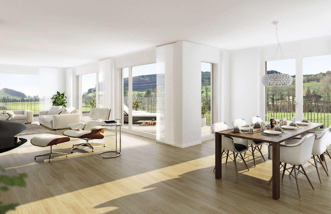 VomSockelgeschossführt eine Treppe aus Terrazzo hinauf zurWohnebeneimObergeschoss. Viel Tageslichtheisst denBesucherhierobenwillkommen, raumhohe Glasschiebetüren gebenden Blick frei in diegrüne Umgebung.Das Obergeschoss stellt gewissermassen dieLogedes Hauses dar:lichtdurchflutetund gegenOsten miteinem herrlichenBlick über St.Margrethen unddie Umgebung.Auf einem →