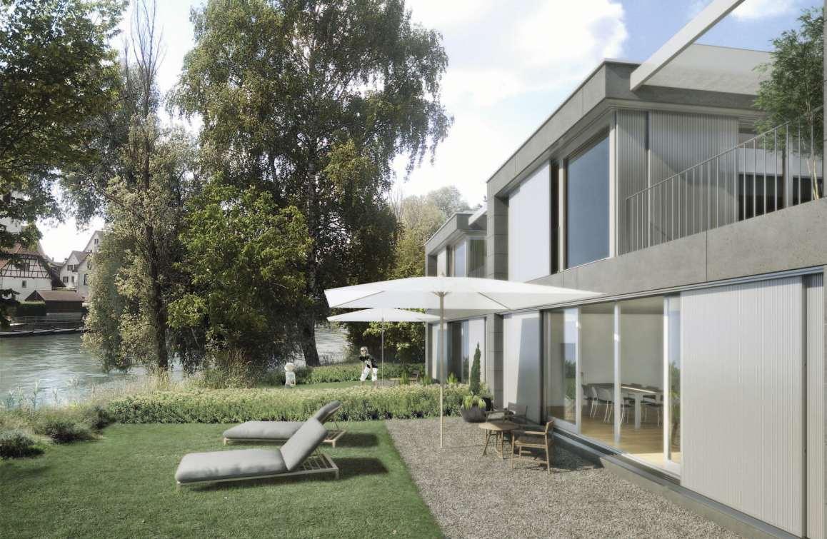 «Das Haus widerspiegeltdie Parzelle», sagt Cédric vonDäniken zumEntwurf: Nordwärtszum Innenhof undzur Strasse istdas Gebäude eingeschossig,gegen den Fluss öffnet es sich undwirdzweigeschossig undgrosszügiger. Beider Architektursprache habensich dieArchitekten an ihrem eigenen,gleich daneben stehendenBürogebäude orientiert, dasinden siebzigerJahren ausSichtbeton undinschnörkelloser