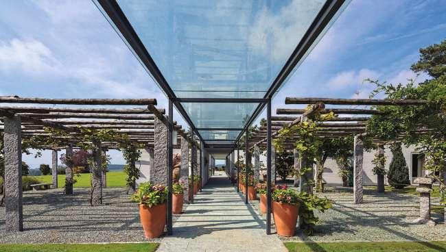 Oben: Im Untergeschoss führen hohe Glastüren in den Garten.