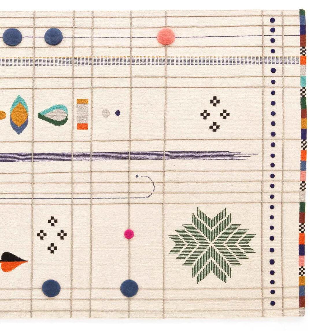 amazing embroidery workshop in Ahmedabad, with 25 highly skilled craftswomen, who were all experts in glistening mirrors, silk and cotton thread and metallic sequins amongst other non-precious materials. on the floor, surrounded by these jewel like elements scattered around them as they worked. Often intricate embroideries took several days to complete. Doshi Levien wanted the collection for Nani Marquina embroideries like studies of different techniques in progress, as they gradually emerge over time. The rugs embody the serendipity and freedom to improvise inherent in each step of a handmade piece;