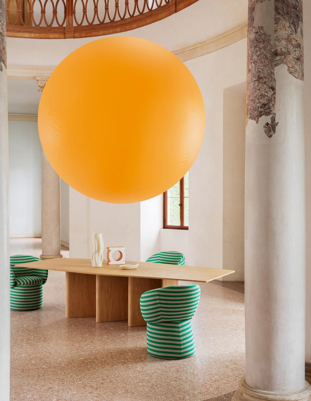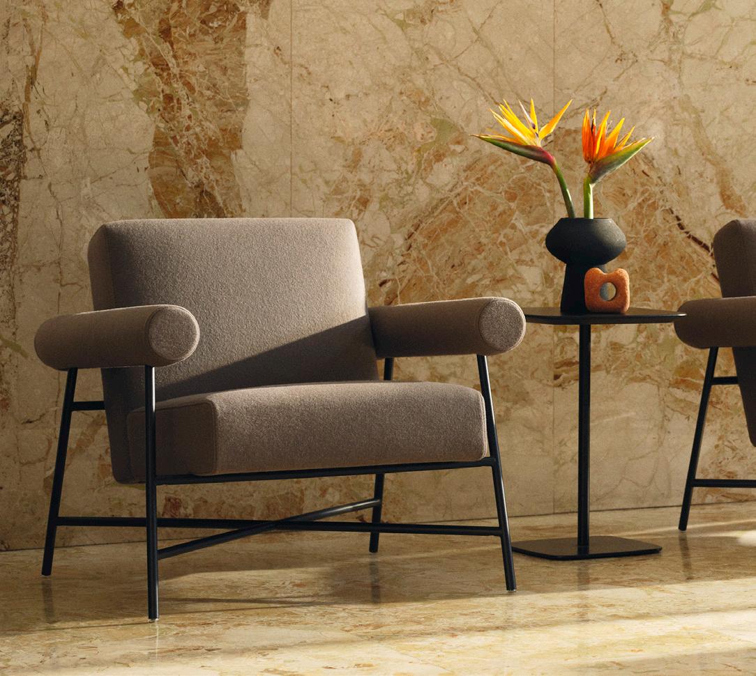 Daydreamer Textile by HBF Textiles | Evelyn Armchair by Mezzo | Nusa Table by dooq | Fulton Market Design Days Shirt by Abbas Husain