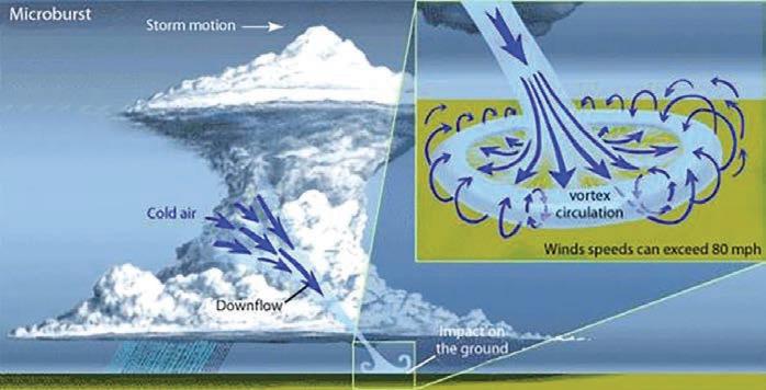 As the weather service explains it, microbursts occur when the updrafts of warm air in those towering cumulonimbus thunderheads are so strong (50 mph and up) that they suspend water droplets and hail in the storm cell’s upper reaches. Ultimately, these droplets cool, thereby weakening the updraft until it can no longer hold all the water and this column of cool air and moisture rushes to the ground in one mighty, but narrowly focused, whoosh.