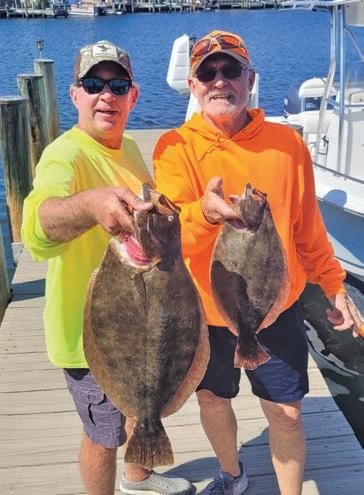 Below left, Young “Captain” Sammy displays a nice catch of mahi in the cockpit of the Pumpin’ Hard. Below middle, The Tortuga out of Bahia Marina has seen some good flounder fishing lately with keepers on most every trip. Below right, Mike Brockmeyer and Stan Tzsyco had keeper flounder of 17.5” and 25.5” in the East Channel on live spot.