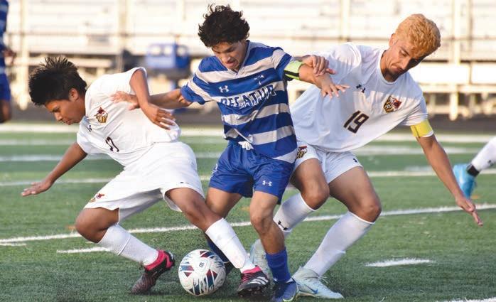 Seahawk Juan Hinojosa battles two Crisfield Crabbers during Friday night’s game. He scored the last goal of the evening.