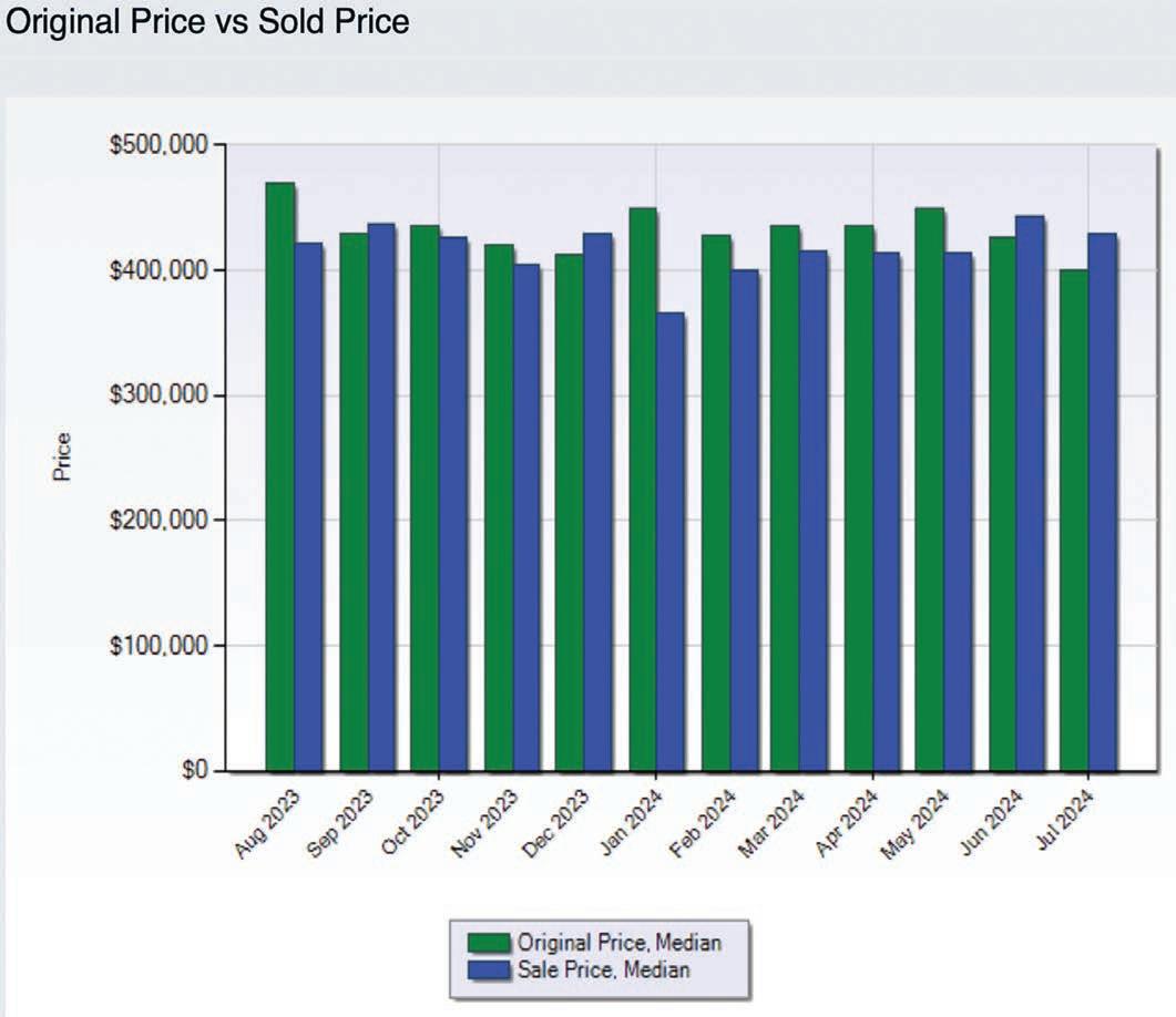 For the month of July, as of July 26, the original price median for properties in the county was $394,470 and the sale price median was $428,000, an 8% increase. For the full month of June, the original price median for properties in the county was $419,000 and the sale price median was $425,000, an 1% increase.