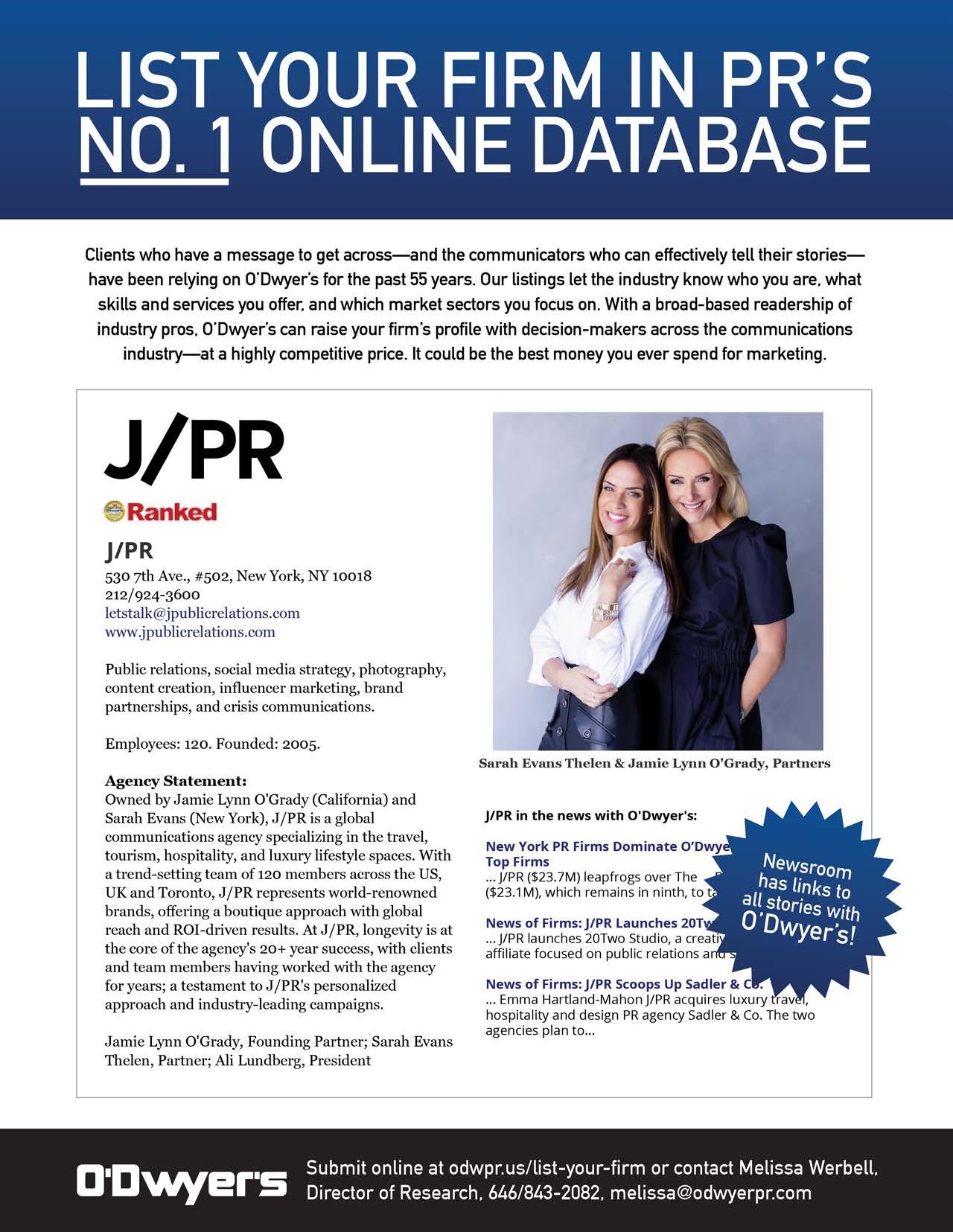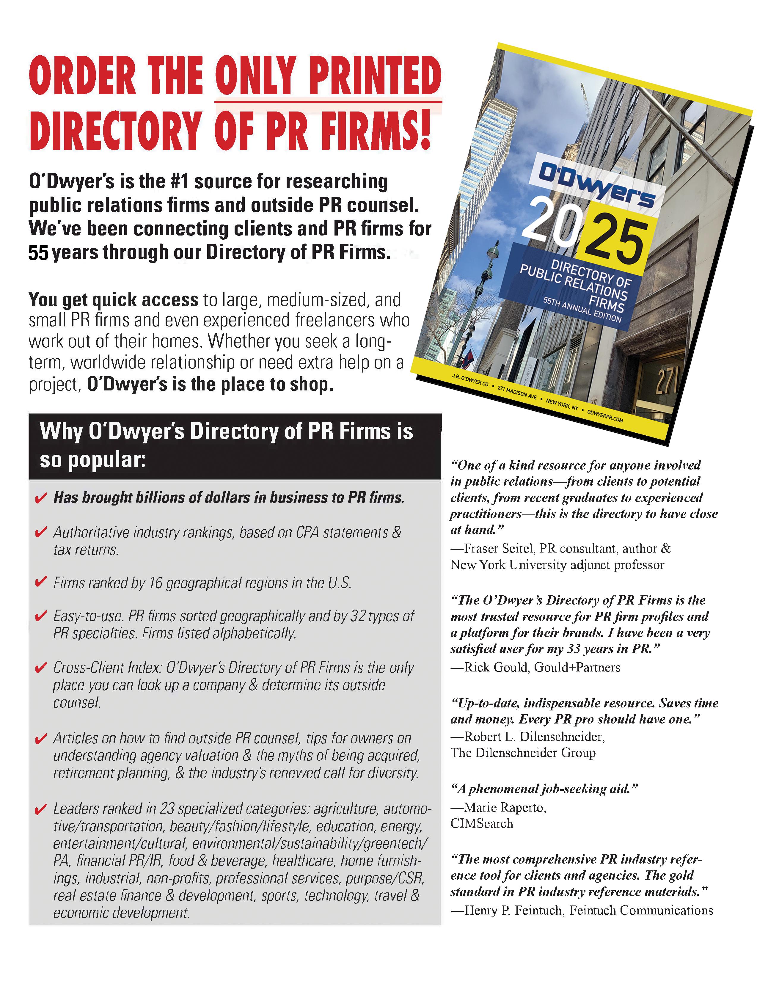 O’Dwyer’s is published seven times a year for $60.00 ($7.00 a single issue) by the J.R. O’Dwyer Co., Inc. 271 Madison Ave., #1500 New York, NY 10016. (212) 679-2471 Fax: (212) 683-2750.