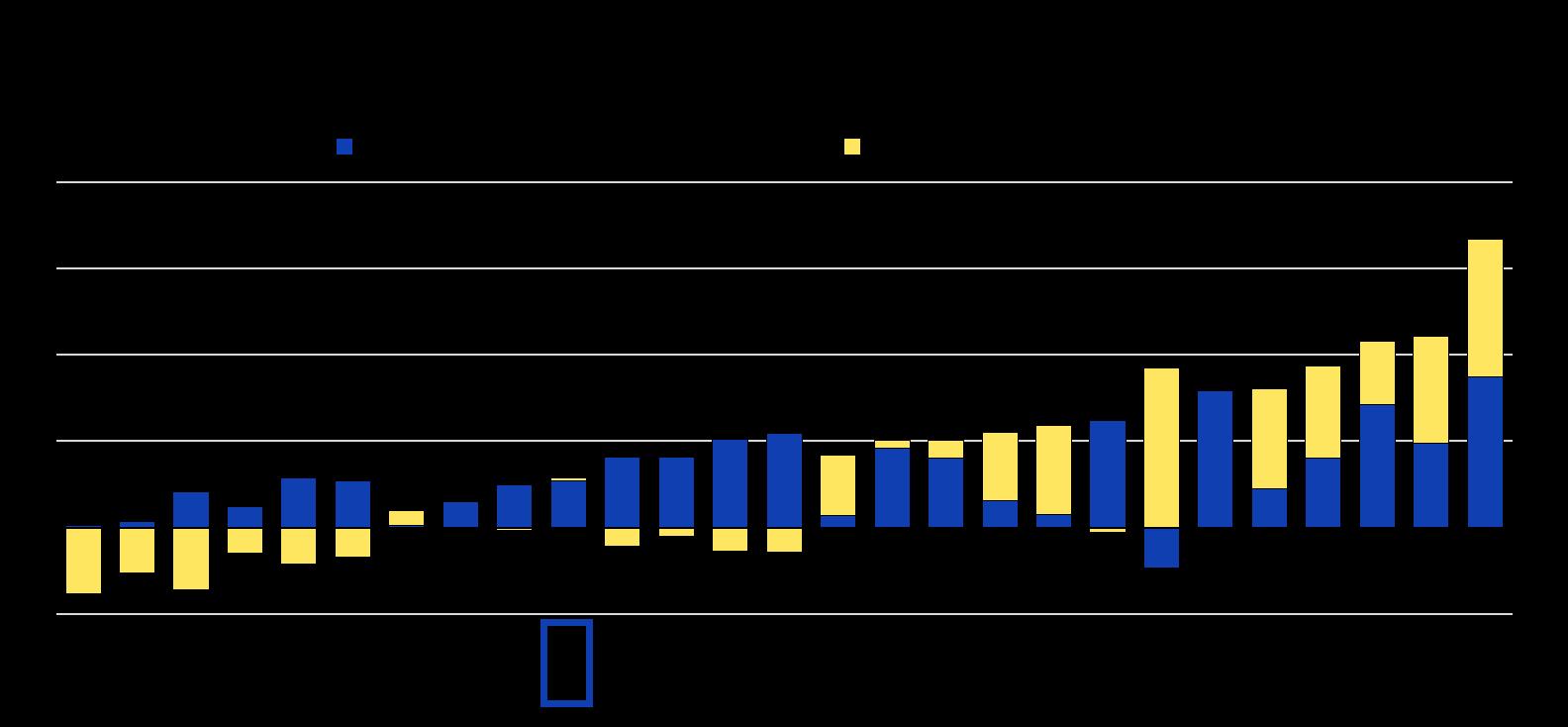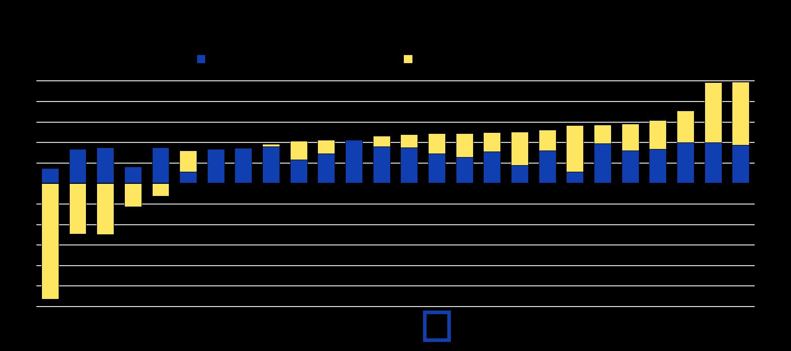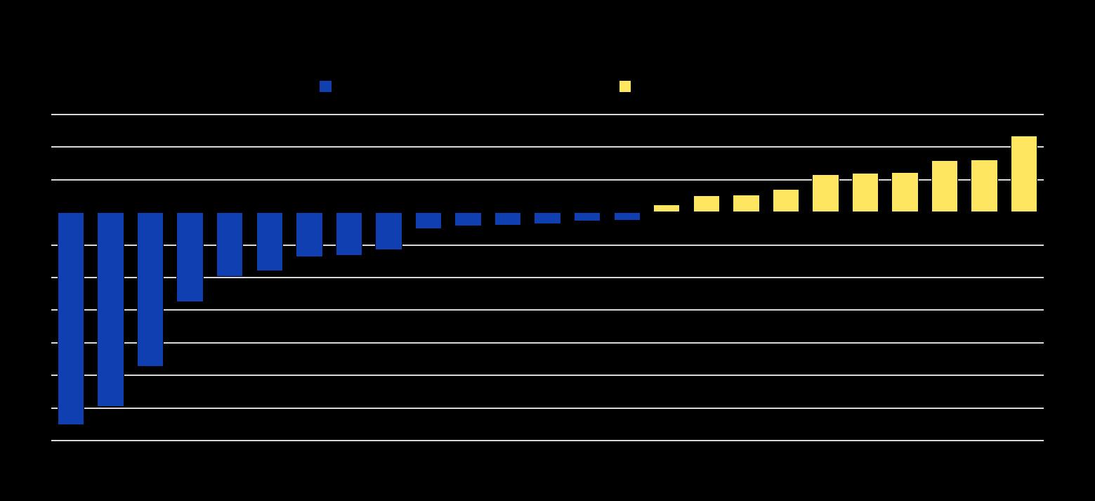 Note : La contribution des personnes nées à l’étranger (dans le pays) indique la variation absolue du nombre de personnes nées à l’étranger (dans le pays) dans la population active, divisée par la variation absolue du nombre total de personnes dans la population active. La somme des composantes « personnes nées à l’étranger » et « personnes nées dans le pays » est égale à la croissance de la population active totale. Les données se rapportent à la population active âgée de 15 ans et plus dans tous les pays, sauf aux États-Unis et au Royaume-Uni pour lesquels les données concernent les 16 ans et plus.