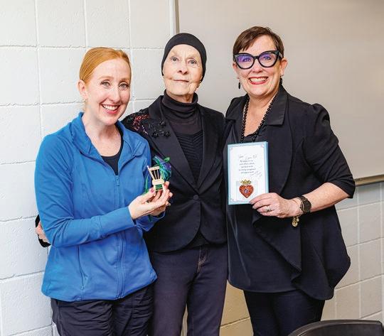 Opposite page: Dean Melanie Shelley, surrounded by fellow deans and President Kenneth Evans, received the trophy for dean with the most Giving Day donors in 2024. Above, top: A gift from Michael Tavlin and Marvona Easley Tavlin allowed the Ann Lacy School of American Dance and Entertainment to buy new finale costumes for the entire 130-person Star Dance Company for the Holiday Spectacular. Above,