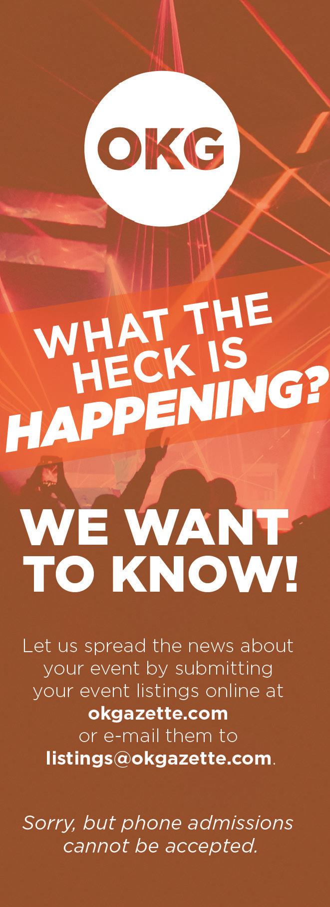 Live music submissions must be received by Oklahoma Gazette no later than noon on Wednesday seven days before the desired publication date. Late submissions will not be included in the listings. Submissions run as space allows, although we strive to make the listings as inclusive as possible. Visit okgazette.com to submit your lisitngs or email listings@okgazette.com. Sorry, but phone submissions cannot be accepted.