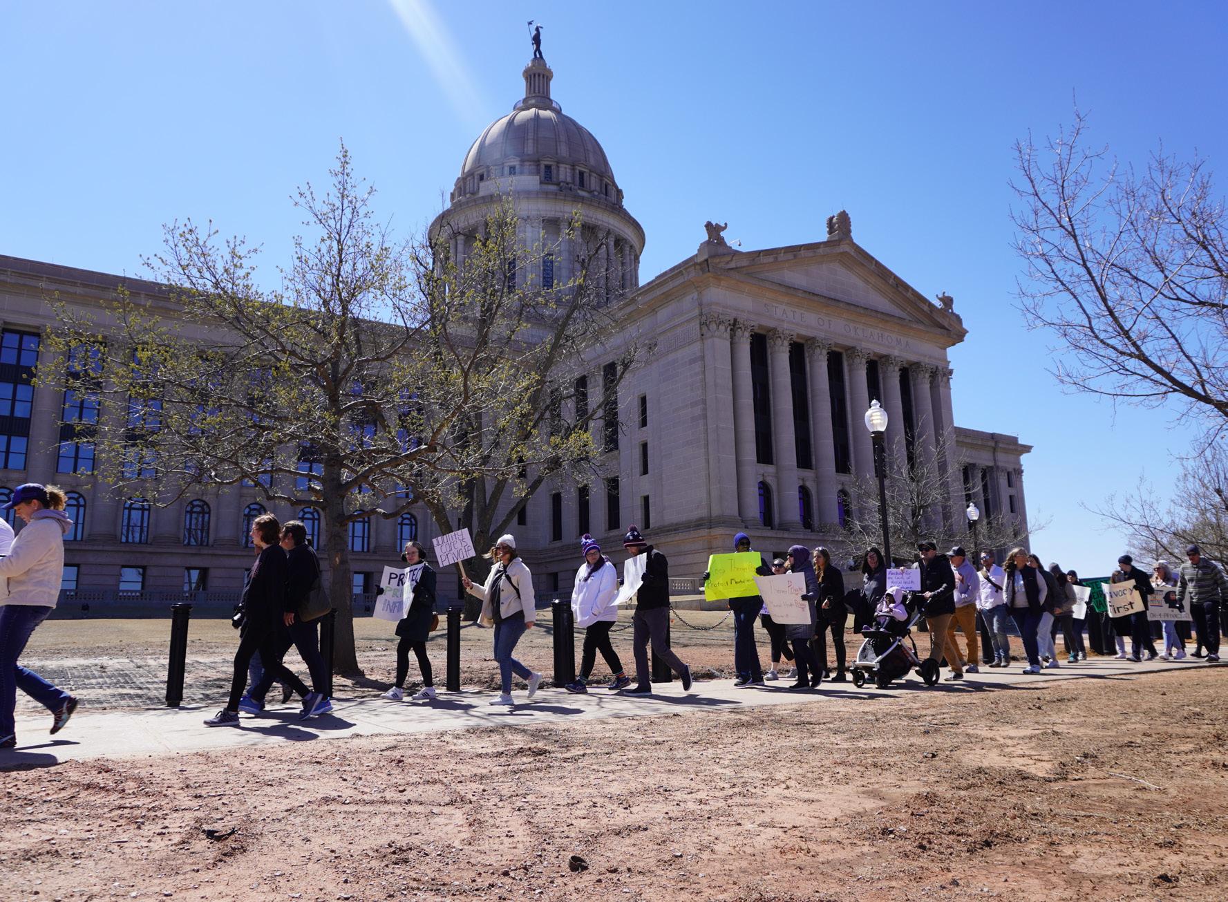 The crowd had marched from the Oklahoma Health Care Authority’s office parking lot, down Lincoln Boulevard before several hours of speeches under a sun fierce enough to burn but too cold to free them from their coats and sweaters.