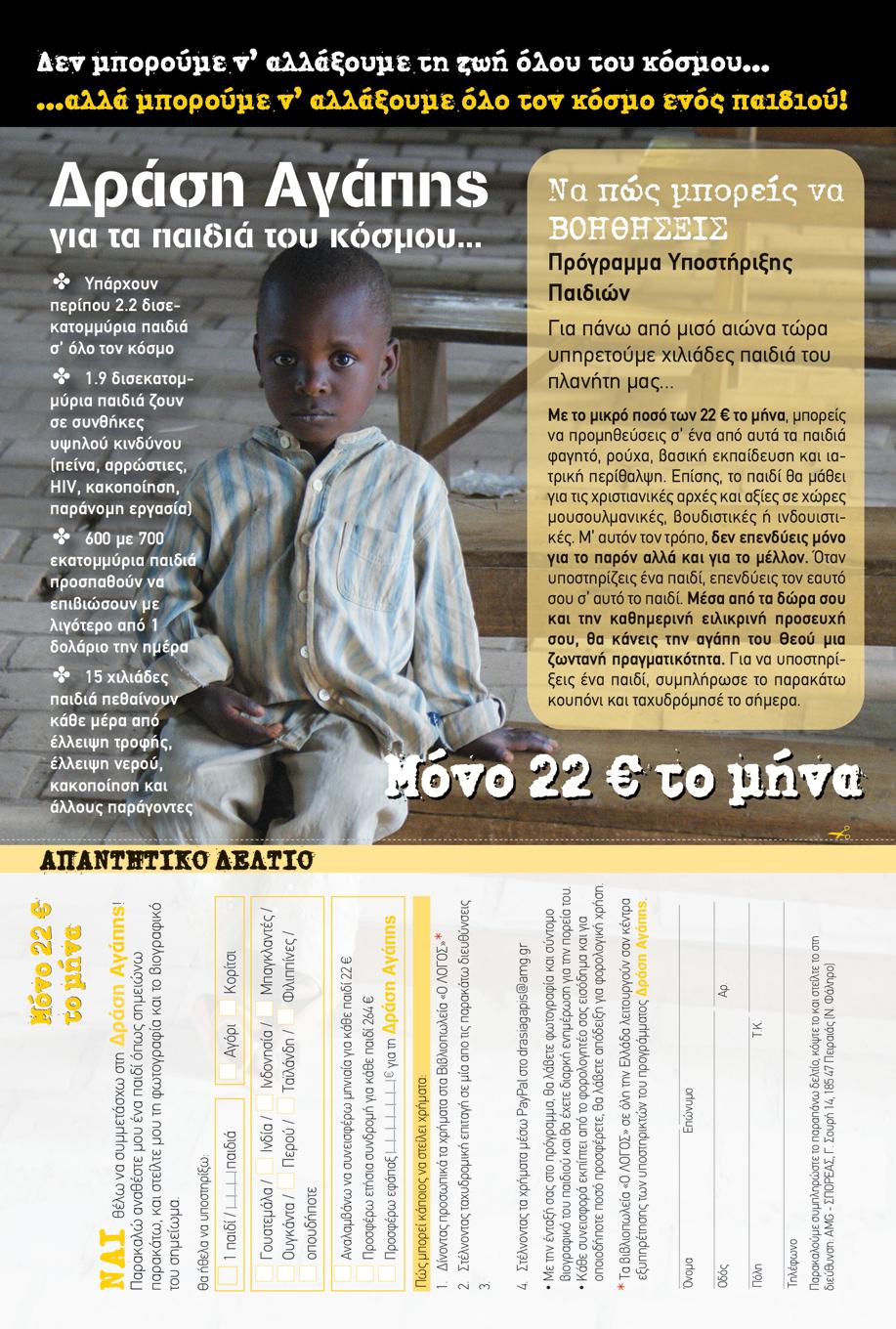 O σκοπός της ιεραποστολής μας είναι: ❉ Να δώσει σε κάθε άνθρωπο στη γη τουλάχιστον μια ευκαιρία να καταλάβει και ν’ ανταποκριθεί στο Ευαγγέλιο. ❉ Να εκφράσει την ευσπλαχνία του Χριστού στις φυσικές ανάγκες του ανθρώπου σ’ όλο τον κόσμο με τις ευκαιρίες και τα μέσα που δίνει ο Κύριος. ❉ Να υπηρετήσει την ηγεσία της τοπικής εκκλησίας, να ενημερώσει και να ενθαρρύνει το λαό του Θεού στην παγκόσμια ευθύνη του. H A.M.G (Advancing the Ministries of the Gospel, που σημαίνει: Αναπτύσσοντας τις Διακονίες του Ευαγγε λίου), είναι μια παγκόσμια χριστιανική ιεραποστολική οργάνωση με ιδρυτή της τον Σπύρο Ζωδιάτη. Το έργο της μέχρι σήμερα είναι ενεργό σε πολλές χώρες του κόσμου, με ένα βασικό διπλό σκοπό: Την κά λυψη των φυσικών, αλλά και πνευματικών αναγκών των ανθρώπων. Φροντίζει για την παροχή τροφής, εν δυμασίας, ιατρικής περίθαλψης και μόρφωσης στους ανθρώπους, πράγματα που είναι απόλυτα αναγκαία για το σώμα και τη διάνοιά τους. Όμως, εμείς οι χριστιανοί ξέρουμε πως ο κάθε άνθρωπος, πέρα από το σώμα και το νου, έχει κι ένα πνεύμα, για τη λύτρωση του οποίου ήρθε στον κόσμο, σταυρώθηκε κι αναστήθηκε ο Κύριός μας Ιησούς Χριστός. Έτσι, με τη βοήθεια του Θεού και την ηθική και υλική συμπαράσταση των χριστιανών, η ιεραποστολή μας κάνει ό,τι μπορεί για την πραγμάτωση του διπλού αυτού σκο πού σ’ όλο τον κόσμο, ανεξάρτητα από φυλή, γλώσσα ή θρήσκευμα, γιατί όλοι έχουν φυσι κές ανάγκες και όλοι χρειάζονται τον Χριστό και τη σωτηρία που Αυτός παρέχει. Γράψτε μας Αν θέλετε να συνεργαστείτε μαζί μας, ενισχύοντάς μας με τακτικές ή έκτακτες εισφορές για τη συνέχιση και την επέκταση του φιλανθρωπικού κι ευαγγελιστικού έργου της ιεραποστολής μας (όταν καλυφθούν οι ανάγκες ενός προγράμματος, οι δωρεές προωθούνται σε άλλα προγράμματα της ιεραποστολής μας), παρακαλούμε γράψτε μας στις παρακάτω διευθύνσεις: ΗΠΑ/Καναδάς: “The Voice of the Gospel” A M G International, P O Box 22000, Chattanooga, Tenn. 37422, U S A Αυστραλία: AMG International “The Voice of the Gospel”, c/o Milton Kalogeropoulos, 1 Miowera Green Greensborough Vic. 3088., AUSTRALIA Γερμανία: Spyridon Kounouslis, Neckarstr 59, Esslingen 73728, Deutschland, Tel.: 071132099857 Commerzbank IBAN DE25611400710823286000 Ελλάδα και υπόλοιπες χώρες: A M G. Σπορέας: Aρ. λογ.: EUROBANK 0026.0040.61.0200212895 IBAN: GR 5402 6004 00000 6102 0021 2895 Αρ. λογ.: ΤΡΑΠΕΖΑ ΠΕΙΡΑΙΩΣ 5144-046244-761 ΙΒΑΝ: GR22 0172 1440 0051 4404 6244 761 Αρ. λογ.: ΕΘΝΙΚΗ ΤΡΑΠΕΖΑ 177/480039-71 ΙΒΑΝ: GR75 0110 1770 0000 1774 8003 971 Τ.Θ. 254, 194 00 Κορωπί, τηλ. 210-4834214, fax: 210-6627506