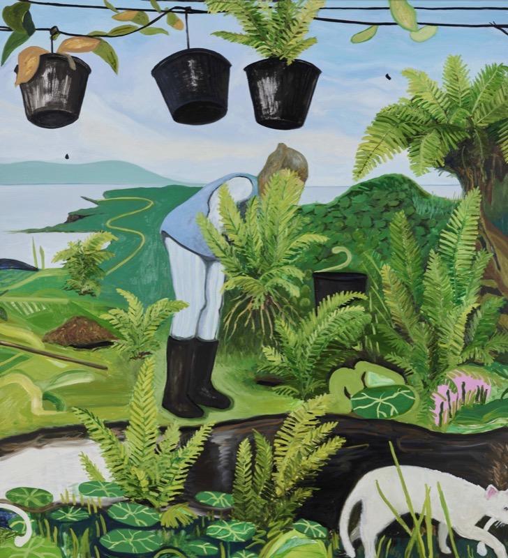 In Fern Harvest Young has turned his aDenBon to rendering labour. Set in a verdant landscape, a seemingly everyday scene depicts a gardener calmly tending to ferns. A trolley system, carrying plants in buckets, travels overhead as a sleek white cat stalks something just beyond the frame. Young says he’s wanted to paint this loaded composiBon for a long Bme, “I spend a lot of Bme thinking about other people’s jobs and what they do all day. I am constantly curious about work and my work as a painter”.