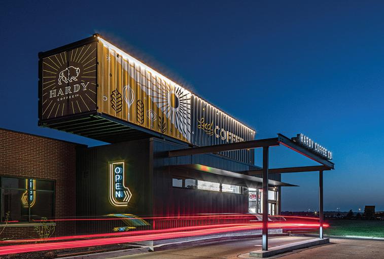 who owned a former bank, which allowed them to add the new Hardy Coffee Kiosk structure within the former bank tenants drive-through canopy area. Using shipping containers, a double stacked concept was developed to maximize the budget, and also the visibility towards the interstate vehicular traffic.