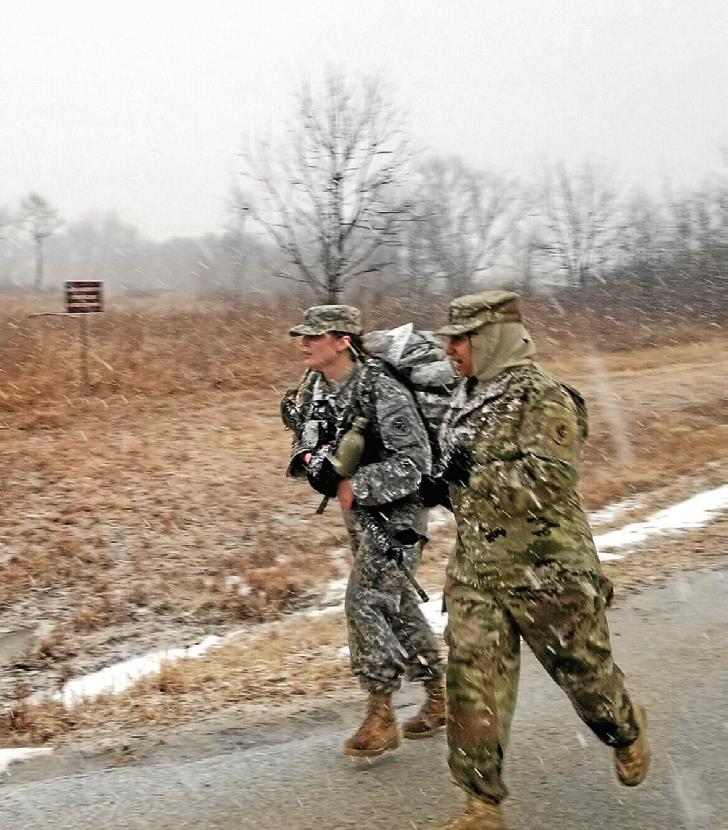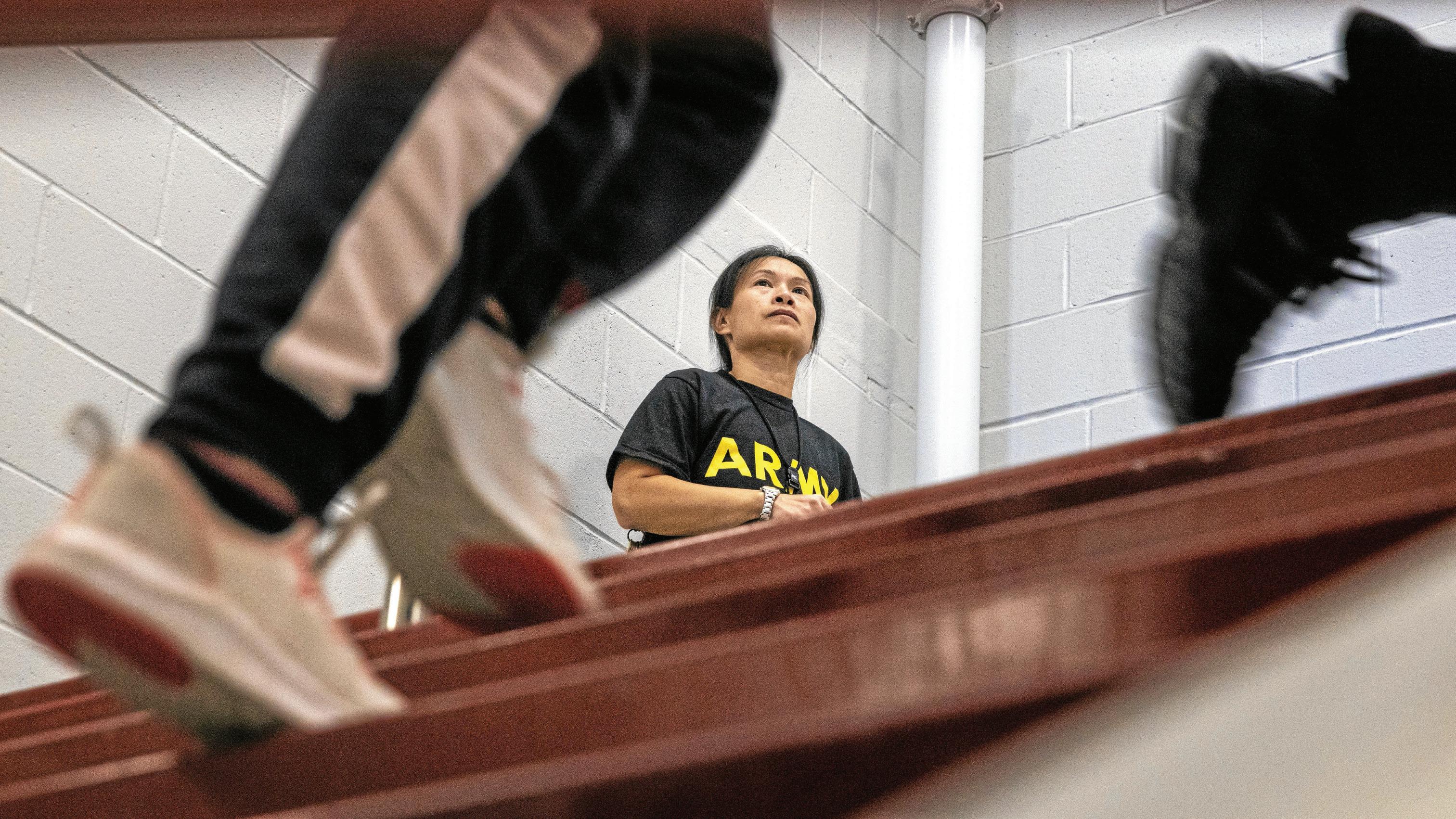 CHRIS MACHIAN , THE WORLD-HERALD buena vista High School roTC instructor retired army maj. yen nguyen has her class run up and down the steps.