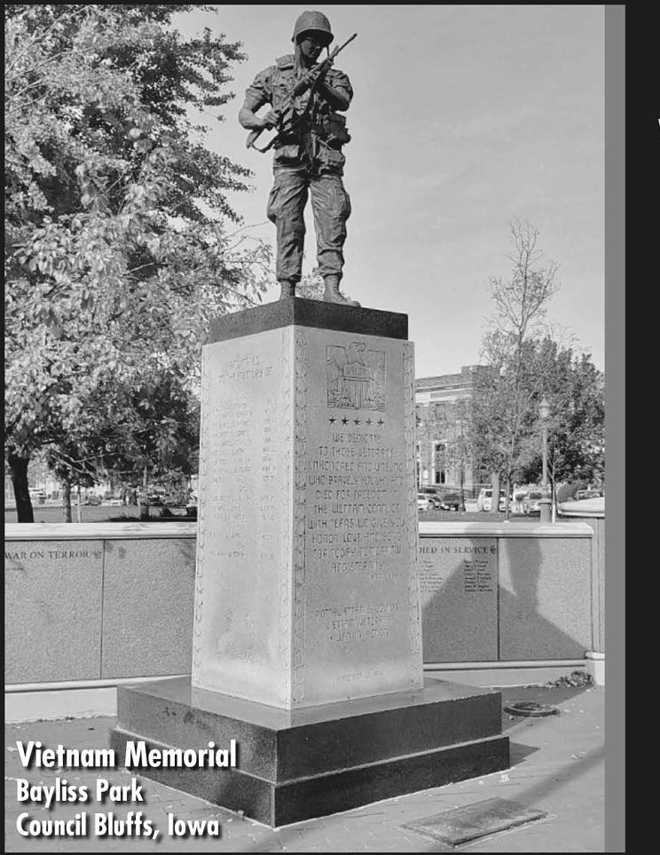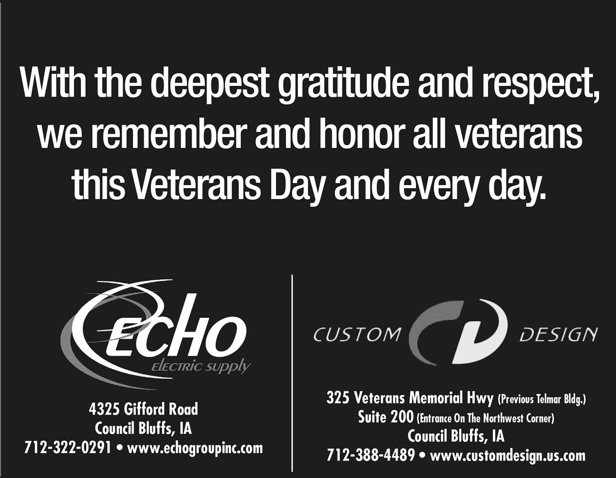 W6 | Sunday, november 6, 2022 SALUTE TO SERVICE FromOurFamily To Yours, ThankYou ForYourService! 3401SouthExpressway CouncilBluffs 712-366-0531 www.McMullenFord.com WeProud ly SupportO ur Co un try’sVetera ns 623SixthAve.,CouncilBluffs,IA51501 712-328-5797•Fax712-328-5726 https://www.pottcounty-ia.gov/departments/veteran_affairs/ OfficeHours:Monday-Friday8:00am-4:30pm PottawattamieCountyVeterans Affairsis Your GatewaytoVeteranServices. Our Nationally AccreditedCaseworkers can assistVeterans in filingforbenefitsthey maybeentitledto receive. STAFF RitaDooley–Director PeggyBecker–CaseworkerIII PaulRosenberg–CaseworkerII RandyMarkel–CaseworkerII SamPettit–CaseworkerI COMMISSIONERS HollyCollins–Chairwoman BradPowell–Secretary MickGuttau–Member BrittanyRockwell–Member DavidHazlewood–Member 712-322-4590 5675McPhersonAve. CouncilBluffs,Iowa ElectricServices forCommercial&IndustrialNeeds ThankYou VeteransForYourService
