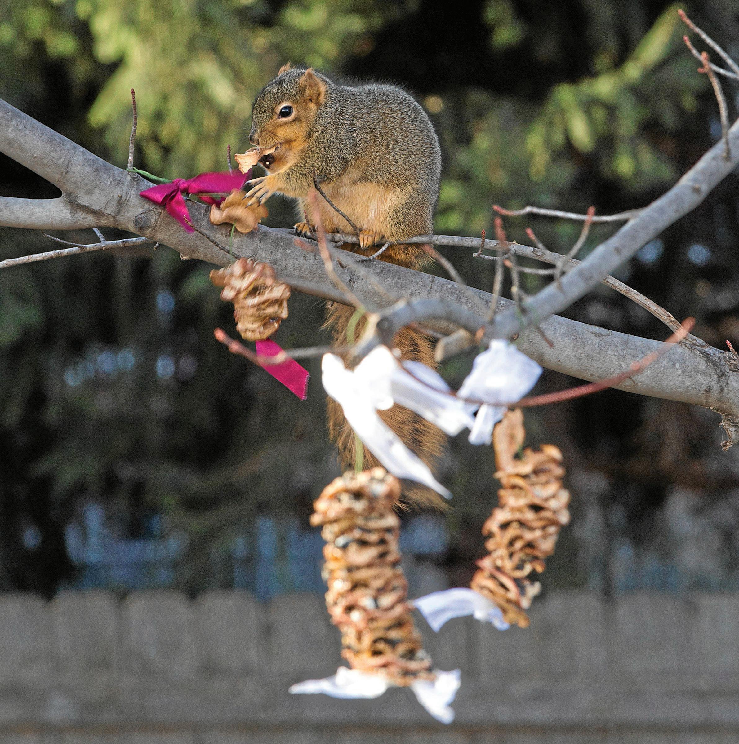 Once the feeders were hung, our resident squirrels found them rst. We had hours of fun watching them nibble away on the seeds and the dried apples