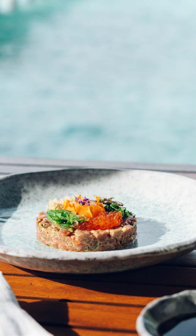 Set over a pale blue lagoon with uninterrupted ocean panoramas. 100% raw food in a relaxed bistro-style setting. Invigorating juices and fresh, handpicked ingredients. Lean cuisine for a healthy lunch. Paired with sunlight glinting on the water and distant views of nearby islands. RAW Raw healthy cuisine