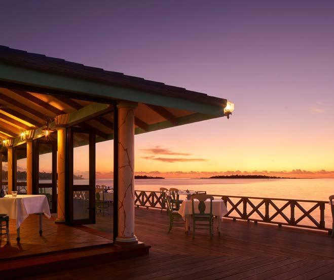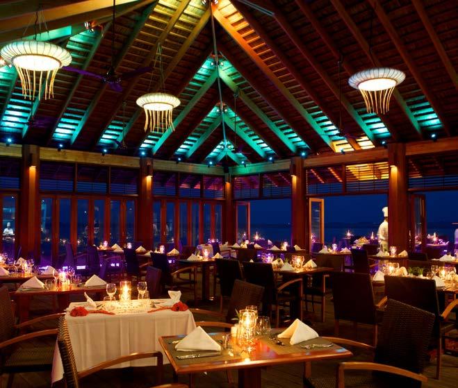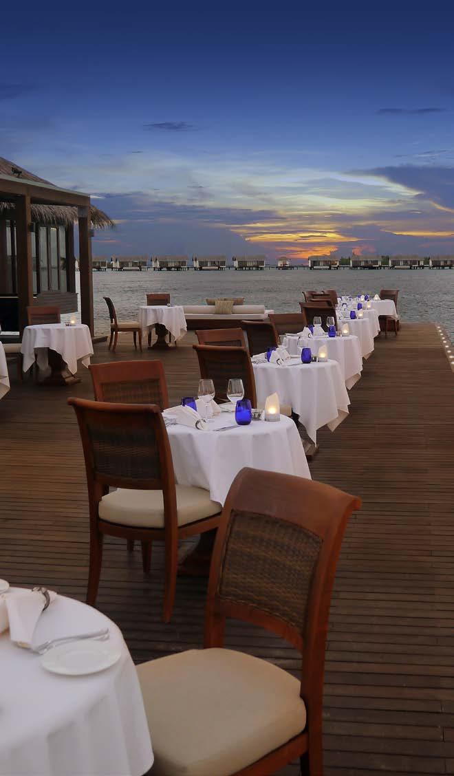 Oceanfront food theatre with dramatic panoramas. Sit by the water’s edge or in one of the private dining pavilions against a perfect Maldivian sunset. Indulge in beautifully prepared PanIndian Ocean specialties or choose from the chef’s signature menu.