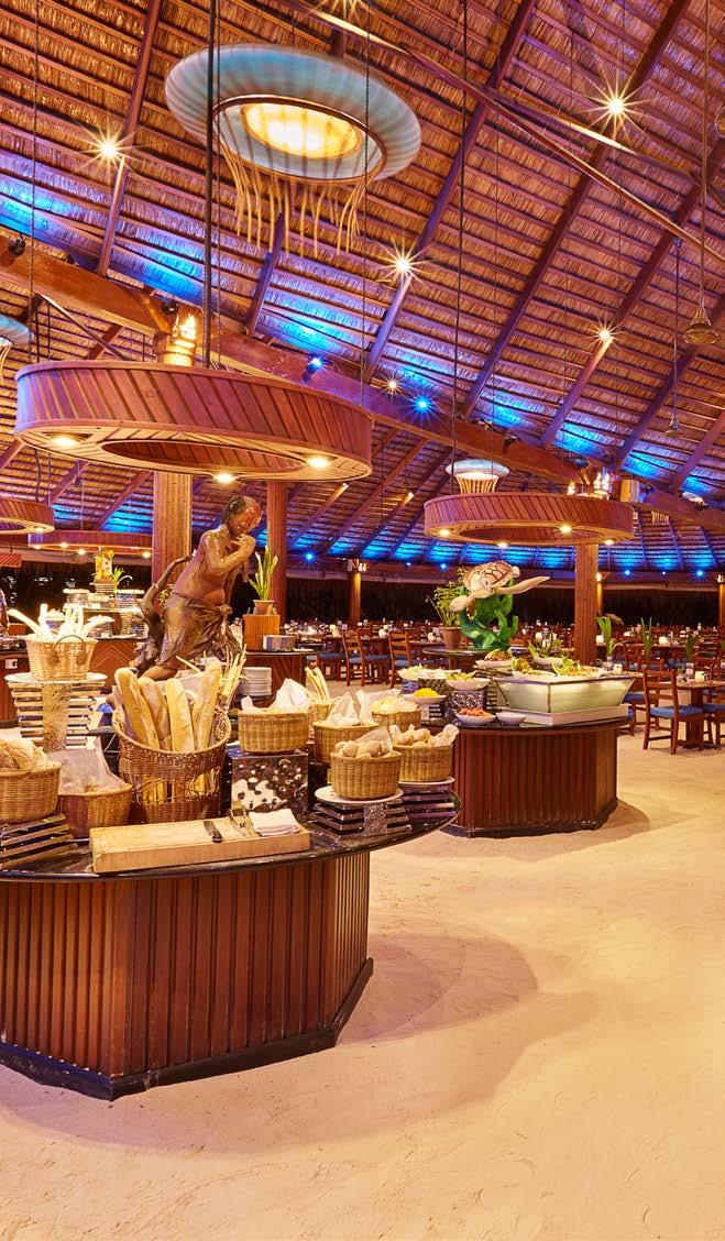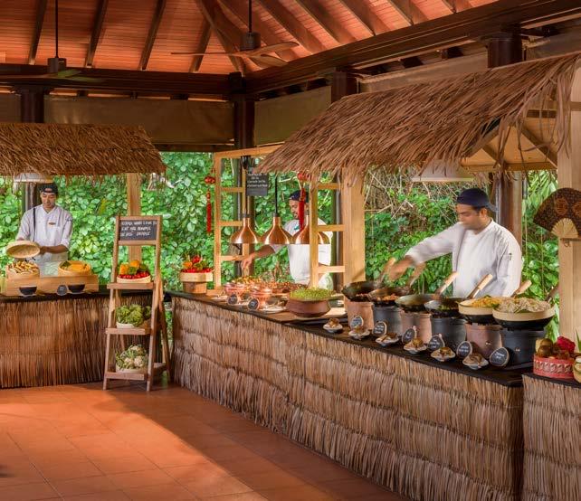 International Buffet service for Breakfast, Lunch, and Dinner. The spread includes Continental, Maldivian, Indian, Sri Lankan, Mediterranean, Italian, Chinese, Japanese, and many more beloved Southeast Asian foods, accompanied by action stations, salad bars, and an extensive desserts aisle.