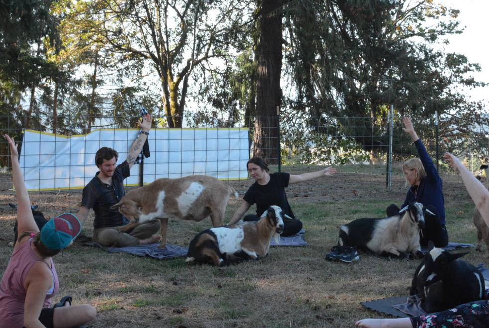 Original Goat Yoga offers a range of unique activities, including yoga classes held throughout the week. While classes are typically outdoors, they can be moved inside the 130-year-old barn in case of bad weather. Each session includes a 30-minute yoga class focused on simple stretching and breathing techniques, followed by a 30-minute Goat Happy Hour, where participants can relax and bond with the goats. “When you come through that gate, the goats look at you and go, ‘You’re here to love me.’ And they love you back,” Morse said.