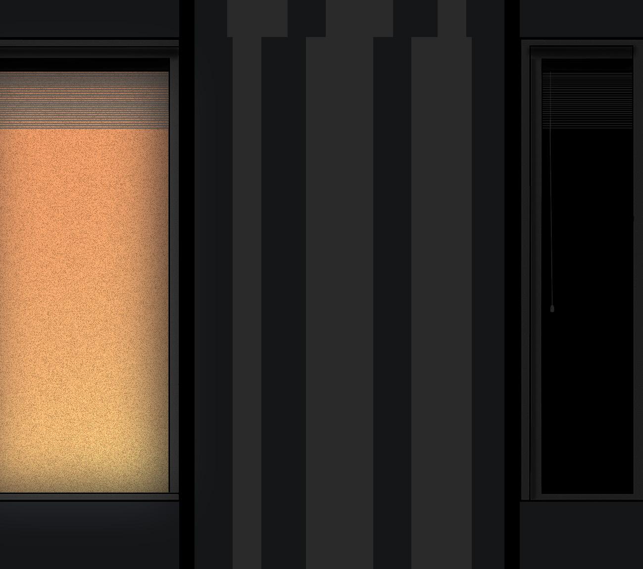 sight to behold. To the right is the grand staircase, robust and handsome, and to the left milled craftsman columns flank the entrance to what was once the parlor. The balusters on the staircase are tightly packed and they are featured in a decoration that hangs below the landing. The wooden features in this house have a certain heft to them uncommon in modern design; it all looks very proud. Underneath the staircase is a built-in bench with a door beside it that opens to a four-foot drop on the outside, perhaps having once opened to a now-missing patio or staircase. Above the landing, light filters in through an ornate red-and-yellow stained glass window.