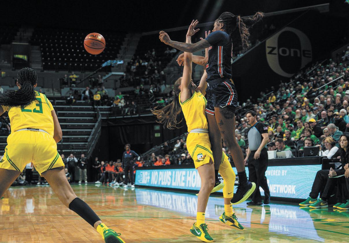 (BELOW) Mar’shaun Bostic (12) jumps and passes the ball over Peyton Scott at Matthew Knight Arena in Eugene on Nov. 20, 2024.