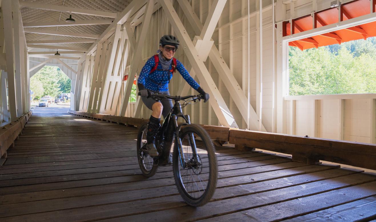 The most family-friendly ride of the scenic bikeways in Oregon is the Covered Bridges Scenic Bikeway in Cottage Grove. Much of it is flat on protected paths away from roads as it loops around a reservoir and winds by several covered bridges. With multiple trailheads, you can pick a length suitable for riders of all ages.