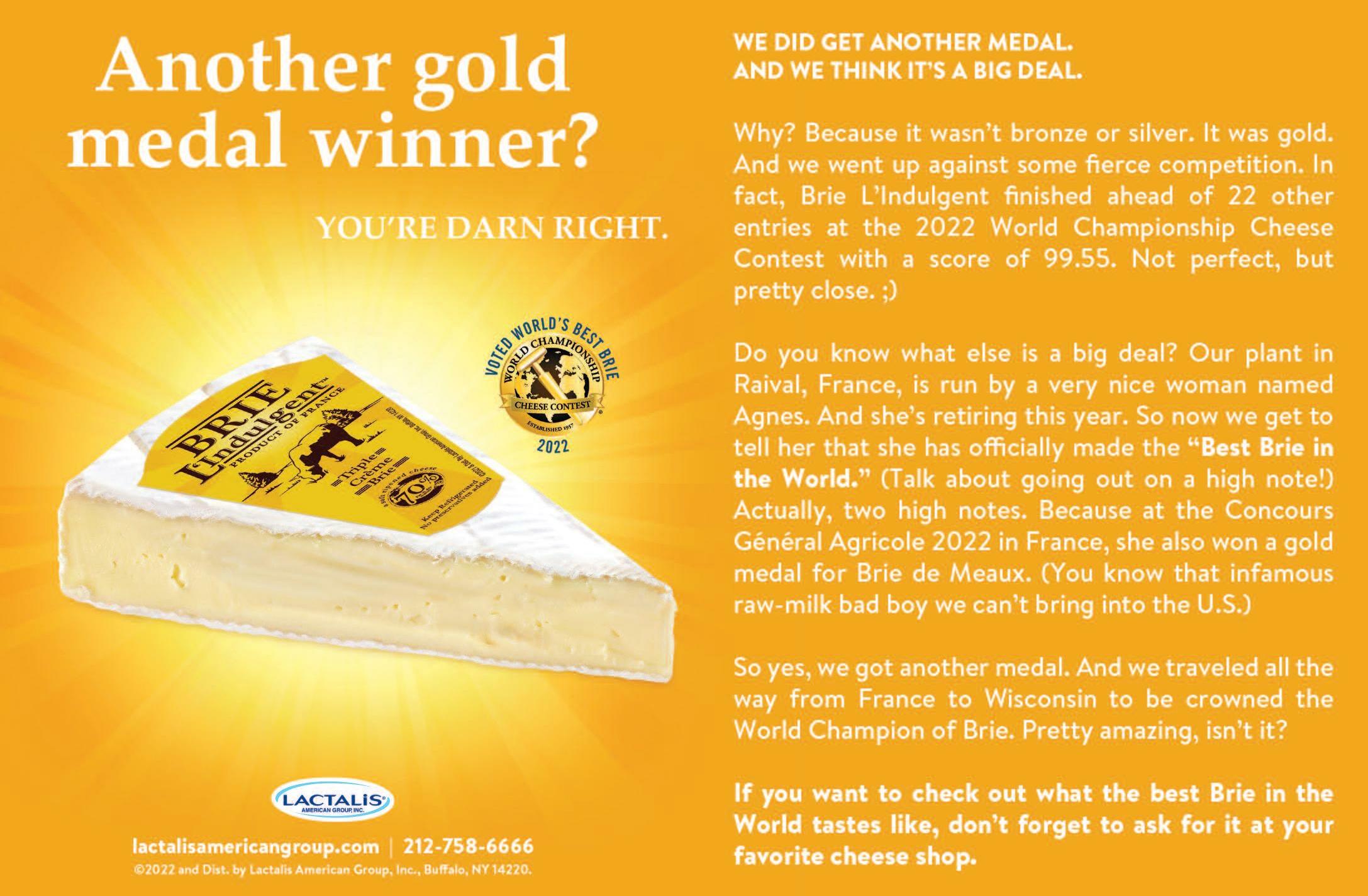 Asiago Vecchio 15 months Le Gruyère AOP Brie L’Indulgent Monti Trentini USA LLC www montitrentini com Interprofession Du Gruyère +41 29 921 84 10 www gruyere com Lactalis American Group 212 758 6666 www.lactalisamericangroup.com Silver medal at the 2017 World Cheese Awards World’s Best Brie at the 2022 World Championship Cheese Contest This