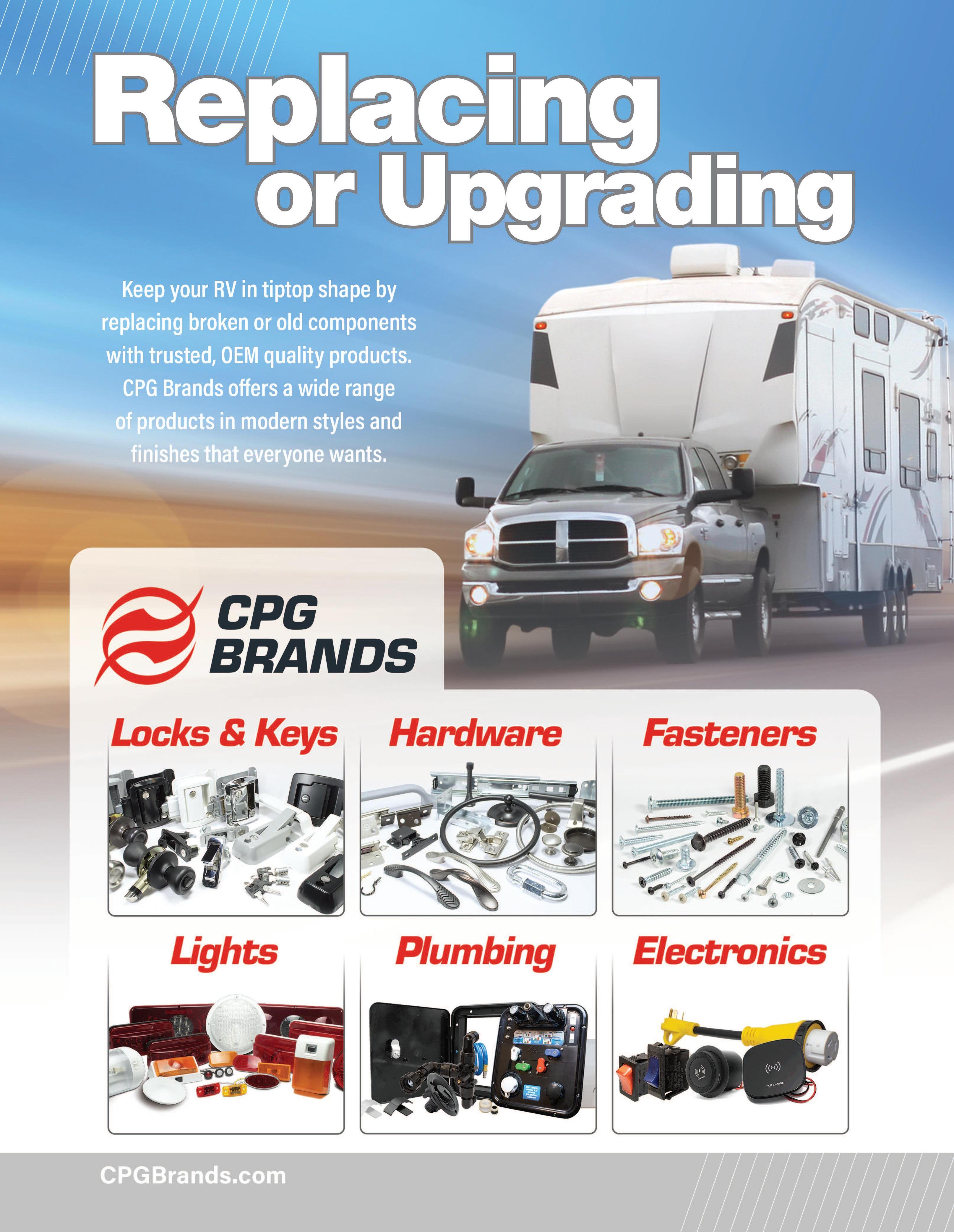 C P G h a s a 1 0 0 , 0 0 0 s q u a r e f o o t facility that is full of over 900 different products consumers need for replacement or upgradeable options on their R V s . A l w a y s l o o k i n g , a n d a l w a y s searching, CPG adds to the growing inventory daily for the benefit of the consumer. You can find all products online at www.rvlam.com.